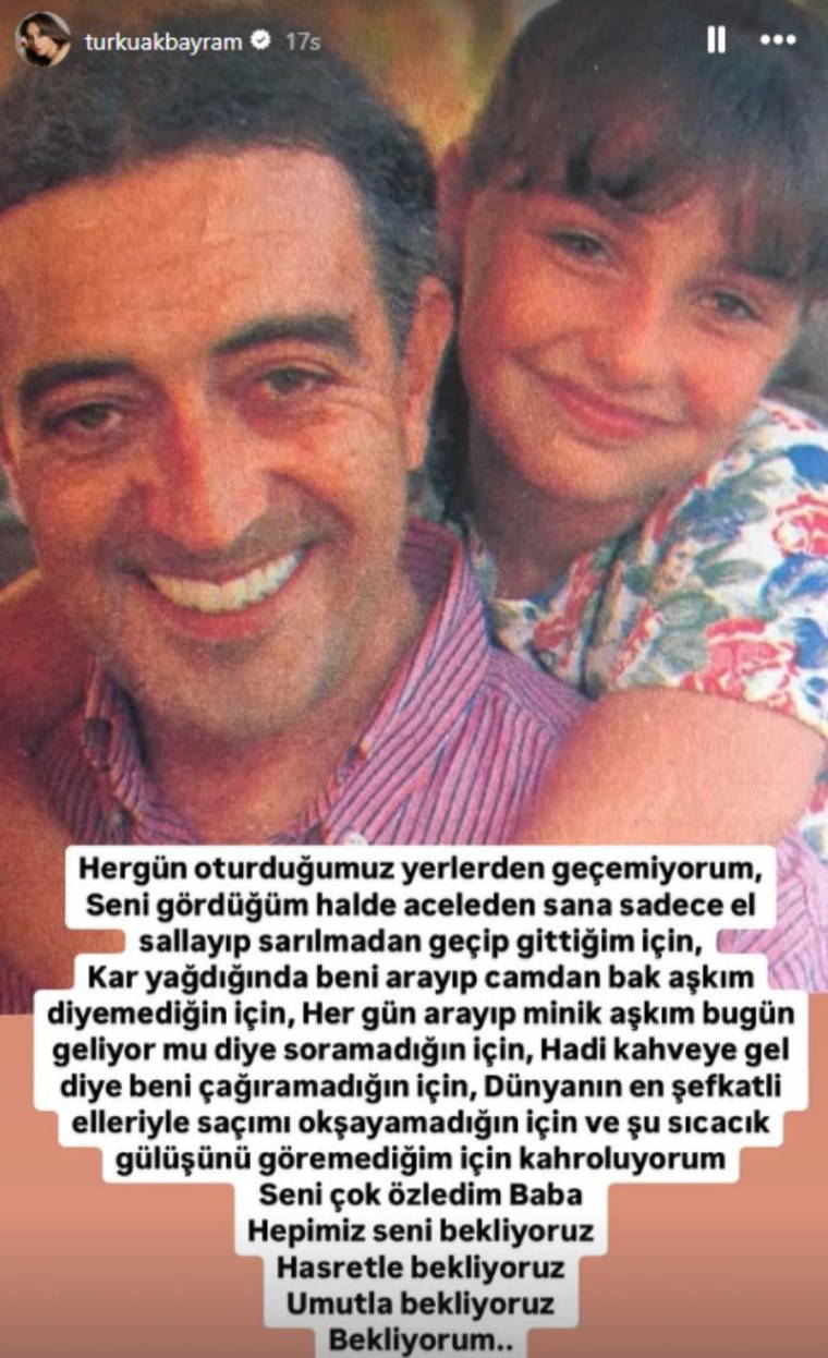 Türkü Akbayram, "Her gün oturduğumuz yerlerden geçemiyorum. Seni gördüğüm halde aceleden sana sadece el sallayıp sarılmadan geçip gittiğim için... Kar yağdığında beni arayıp 'camdan bak aşkım' diyemediğin için... Her gün arayıp 'minik aşkım bugün geliyor mu?' diye soramadığın için... 'Hadi kahveye gel' diye beni çağıramadığın için... Dünyanın en şefkatli elleriyle saçımı okşayamadığın için ve şu sıcacık gülüşünü göremediğim için kahroluyorum. Seni çok özledim baba. Hepimiz seni bekliyoruz. Hasretle bekliyoruz. Umutla bekliyoruz. Bekliyorum" ifadelerini kullandı.