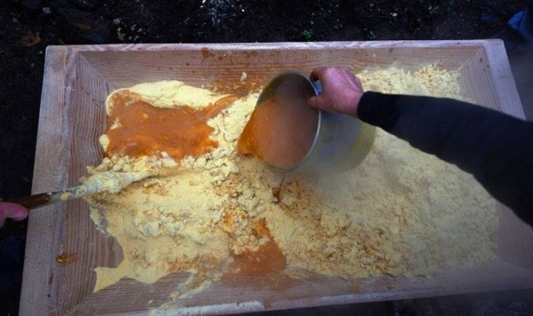 Karışıma kazanda püre haline gelen kabakların eklenmesiyle oluşan hamur yaklaşık 2 saat dinlendiriliyor. Elle yoğurulan hamur, ekşi mayayla karıştırılarak 2 saat daha mayalanmaya bırakılıyor.