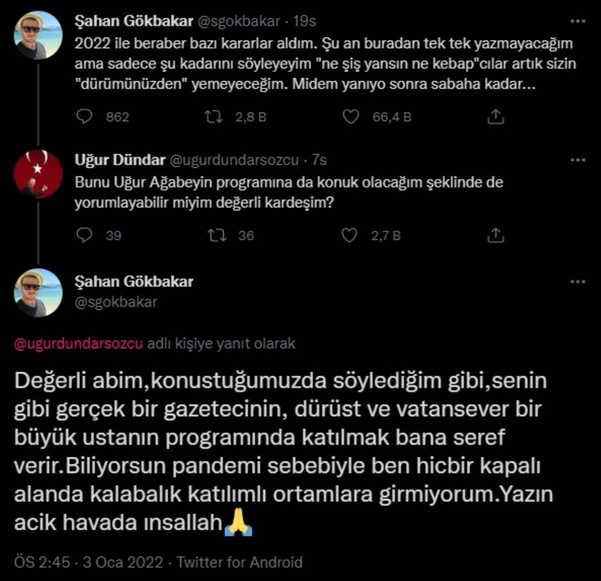 Gökbakar'a sosyal medyadan seslenen Dündar, "Bunu 'Uğur Ağabeyin programına da konuk olacağım' şeklinde de yorumlayabilir miyim değerli kardeşim?" dedi.