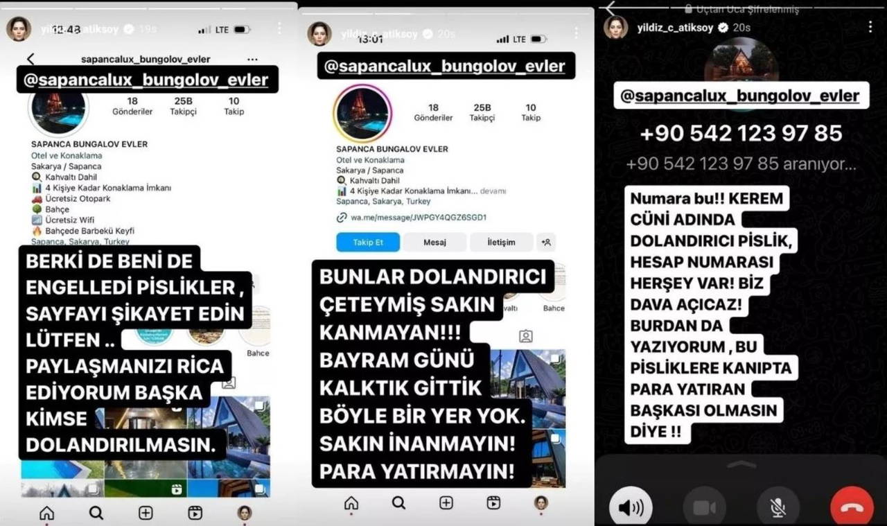 "Bunlar dolandırıcı çeteymiş. Bayram günü kalktık gittik ama böyle bir yer yok. O paranın kat kat fazlası çıkacak sizden, rezil pislikler. Bizi dolandırmanın bedelini ödeyeceksiniz. Asla peşinizi bırakmayacağız. Telefon ettik, 'Yanlış numara' diye açtı yüzsüzler. Berk'i de beni de sosyal medyadan engellediler. İlk işimiz dava açmak olacak."