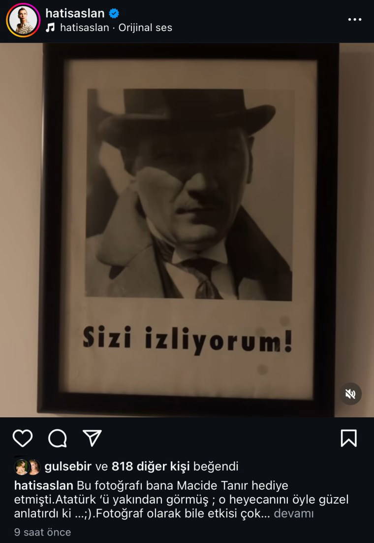 Bu fotoğrafı bana Macide Tanır hediye etmişti. Atatürk'ü yakından görmüş; o heyecanını öyle güzel anlatırdı ki... Fotoğraf olarak bile etkisi çok kıymetli bende. Daima beni izliyormuş gibi, dikkatli ve özenle işimi, aşımı yapıyorum. Bu vatan size minnettar, Atam. Dualarım sizinle.