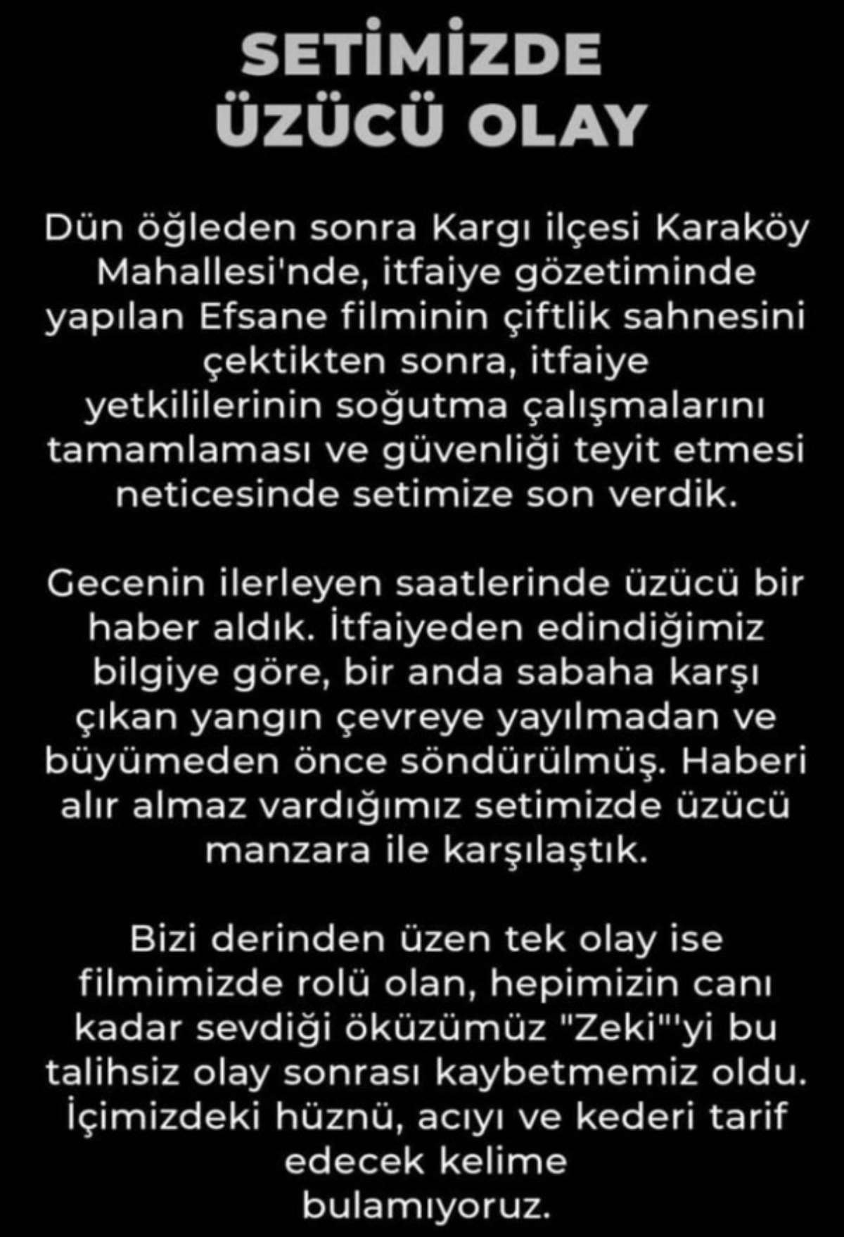 "Dün öğleden sonra Kargı ilçesi Karaköy Mahallesi'ndeki, itfaiye gözetiminde yapılan Efsane filminin çiftlik sahnesini çektikten sonra itfaiye yetkililerinin soğutma çalışmalarını tamamlaması ve güvenliği teyit etmesi neticesinde setimize son verdik. Gecenin ilerleyen saatlerinde üzücü bir haber aldık."
