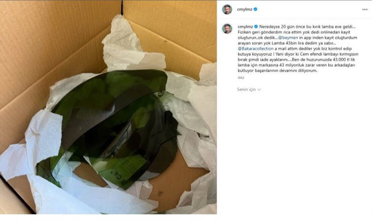 Kırık lambanın da fotoğrafını paylaşan Cem Yılmaz "Neredeyse 20 gün önce bu kırık lamba eve geldi… Fiziken geri gönderdim, rica ettim, 'yok, onlinedan kayıt oluşturun' dedi. Tamam dedik… Kayıt oluşturdum arayan soran yok. Lamba 43 bin lira, ya sabır… Mail attım, 'yok biz kontrol edip kutuya koyuyoruz' dediler. Yani diyor ki 'Cem efendi lambayı kırmışssın bırak şimdi iade ayaklarını. Ben de huzurunuzda 43 bin liralık lamba için markasına 43 milyonluk zarar veren bu arkadaşları kutluyor başarılarının devamını diliyorum" ifadelerini kullanmıştı.