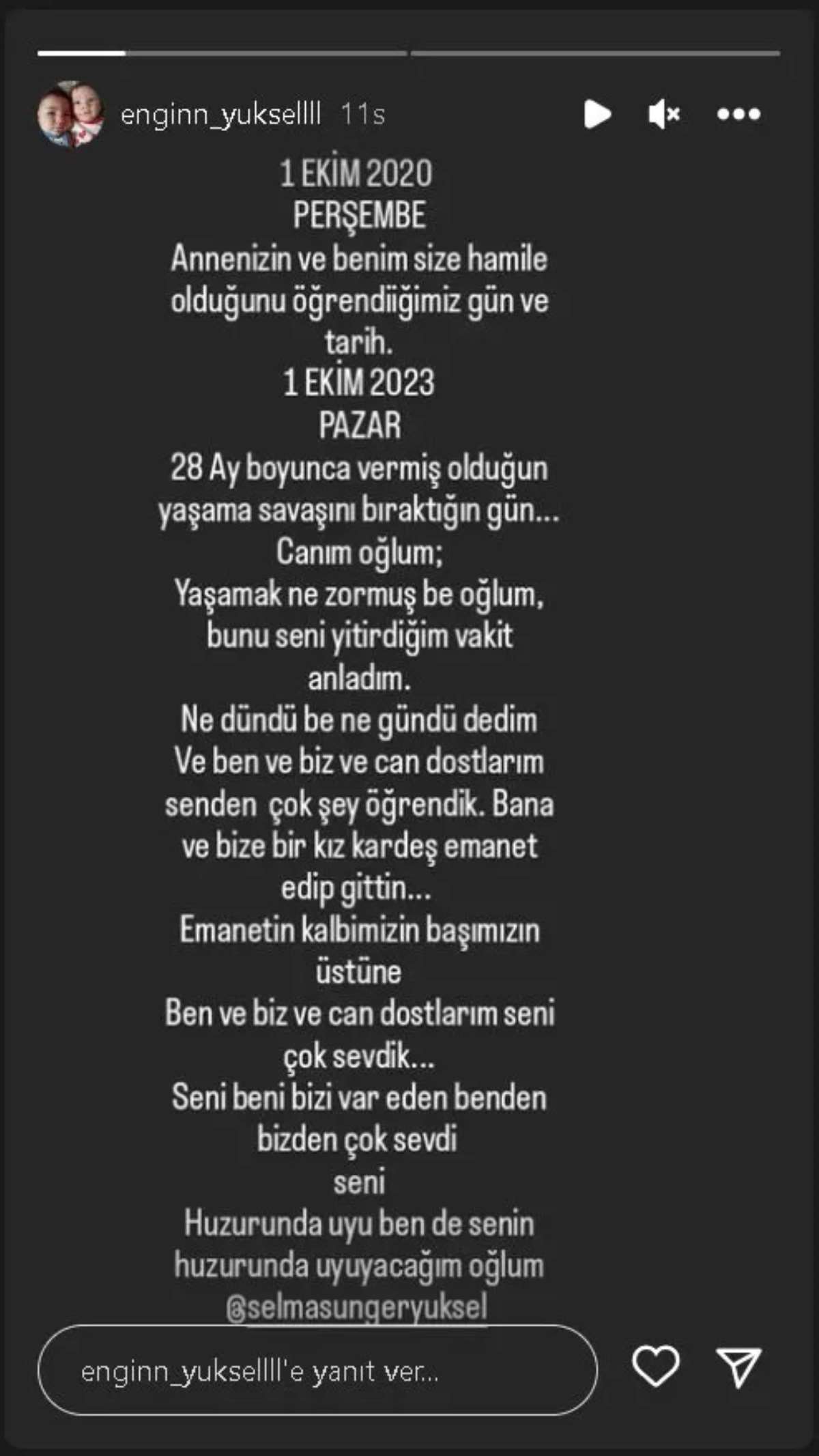 "1 Ekim 2020 Perşembe, annenizin ve benim size hamile olduğunu öğrendiğimiz gün ve tarih. 1 Ekim 2023 Pazar, 28 ay boyunca vermiş olduğun yaşama savaşını bıraktığın gün... Canım oğlum; Yaşamak ne zormuş be oğlum, bunu seni yitirdiğim vakit anladım. Ne dündü be ne gündü dedim ve ben ve biz can dostlarım senden çok şey öğrendik. Bana ve bize bir kız kardeş emanet edip gittin... Emanetin kalbimizin başımızın üstüne. Ben ve biz ve can dostlarım seni çok sevdik... Seni beni bizi var eden benden bizden çok sevdi seni. Huzurunda uyu bende senin huzurunda uyuyacağım oğlum."