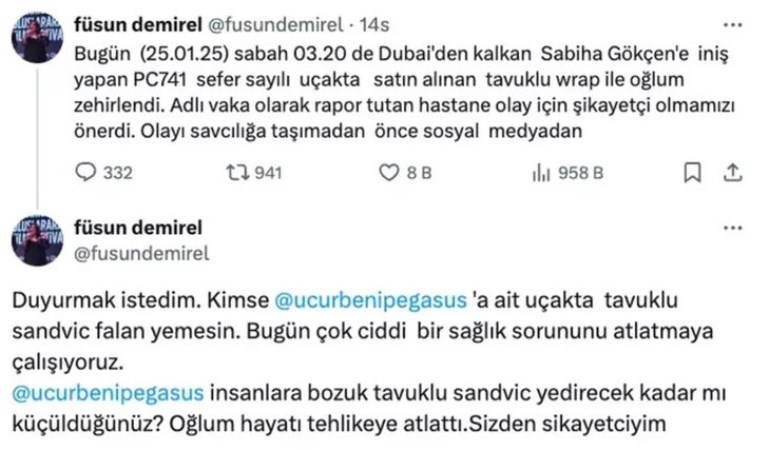"Bugün (25.01.25) sabah 03.20'de Dubai'den kalkan, Sabiha Gökçen'e iniş yapan PC741 sefer sayılı uçakta satın alınan tavuklu wrap ile oğlum zehirlendi. Adli vaka olarak rapor tutan hastane olay için şikâyetçi olmamızı önerdi. Olayı savcılığa taşımadan önce sosyal medyadan duyurmak istedim. Kimse Pegasus’a ait uçakta tavuklu sandviç yemesin. Bugün çok ciddi bir sağlık sorununu atlatmaya çalışıyoruz. Pegasus, insanlara bozuk tavuklu sandviç yedirecek kadar mı küçüldünüz? Oğlum hayati tehlikeyi atlattı. Sizden şikâyetçiyim."