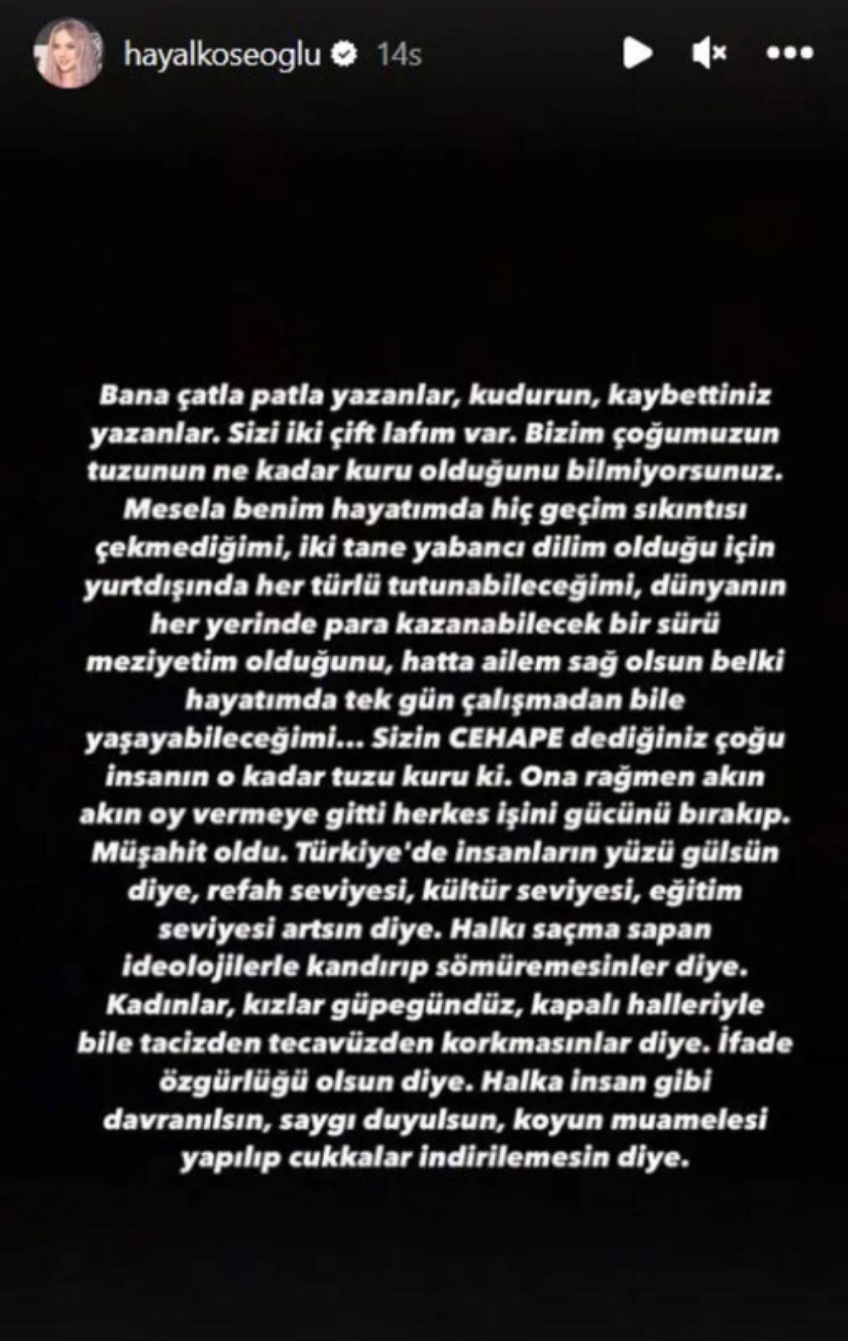 "Bana çatla patla yazanlar, kudurun, kaybettiniz yazanlar. Size iki çift lafım var; bizim çoğumuzun tuzunun ne kadar kuru olduğunu bilmiyorsunuz. Mesela benim hayatımda hiç geçim sıkıntısı çekmediğimi, iki tane yabancı dilim olduğu için yurt dışında her türlü tutunabileceğimi, dünyanın her yerinde para kazanabilecek bir türlü meziyetim olduğunu, hatta ailem sağ olsun belki hayatımda tek gün çalışmadan bile yaşayabileceğimi... Sizin CEHAPE dediğiniz çoğu insanın o kadar tuzu kuru ki. Ona rağmen akın akın oy vermeye gitti herkes işini gücünü bırakıp. Müşahit oldu. Türkiye'de insanların yüzü gülsün diye, refah seviyesi, kültür seviyesi, eğitim seviyesi artsın diye. Halkı saçma sapan ideolojilerle kandırıp sömüremesinler diye. Kadınlar kızlar güpegündüz, kapalı halleriyle bile tacizden tecavüzden korkmasınlar diye. Halka insan gibi davranılsın, saygı duyulsun, koyun muamelesi yapılıp cukkalar indirilemesin diye."