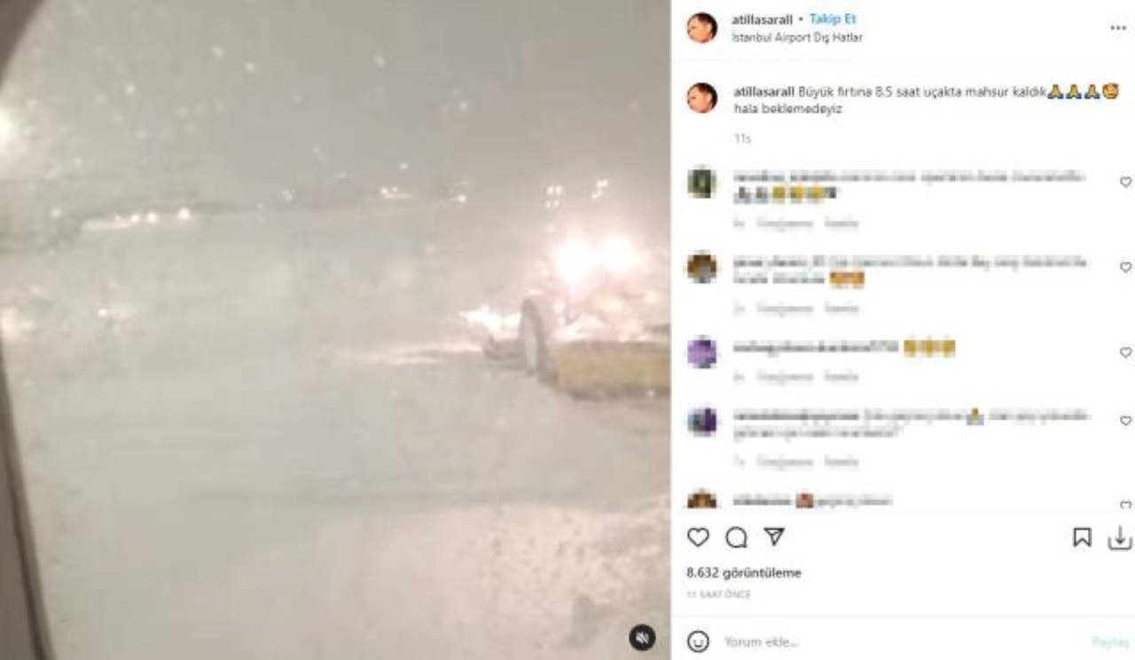 Saral, uçağın içinden yapılan çalışmaları yayınlayıp, “Büyük fırtına 8.5 saat uçakta mahsur kaldık. Hâlâ beklemedeyiz. Çok zor çok” diye yazdı.