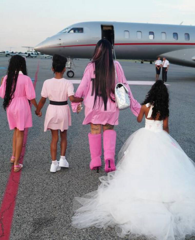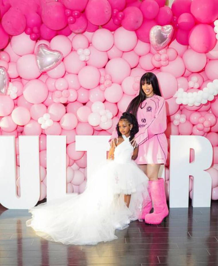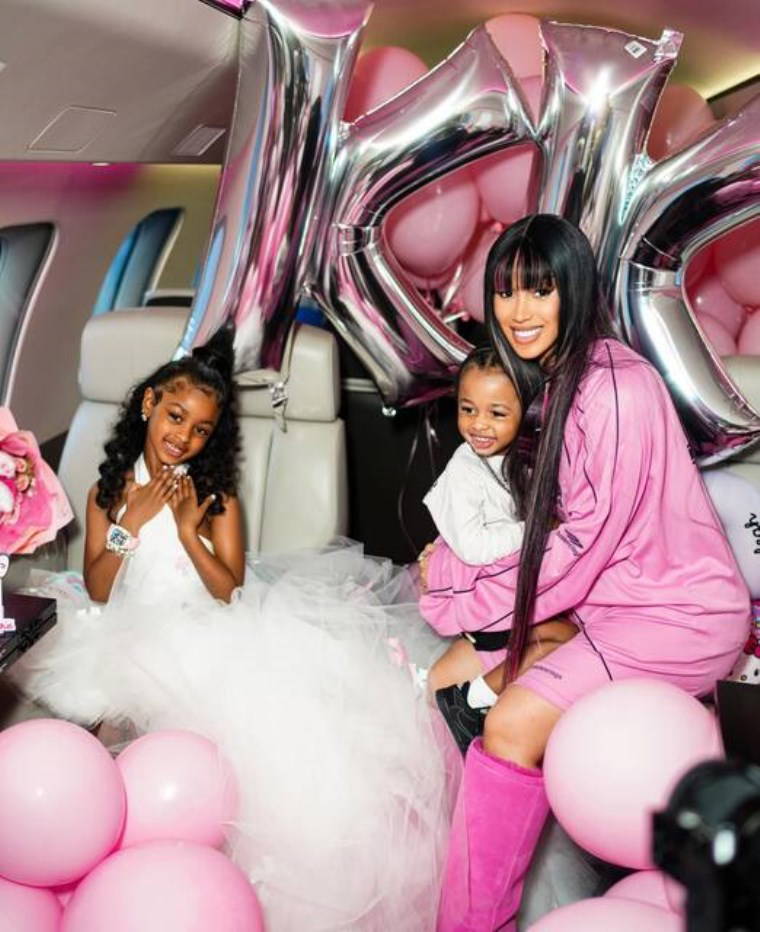 Cardi B de parlak pembe kombini ve gösterişli çizmeleriyle kızına eşlik etti.