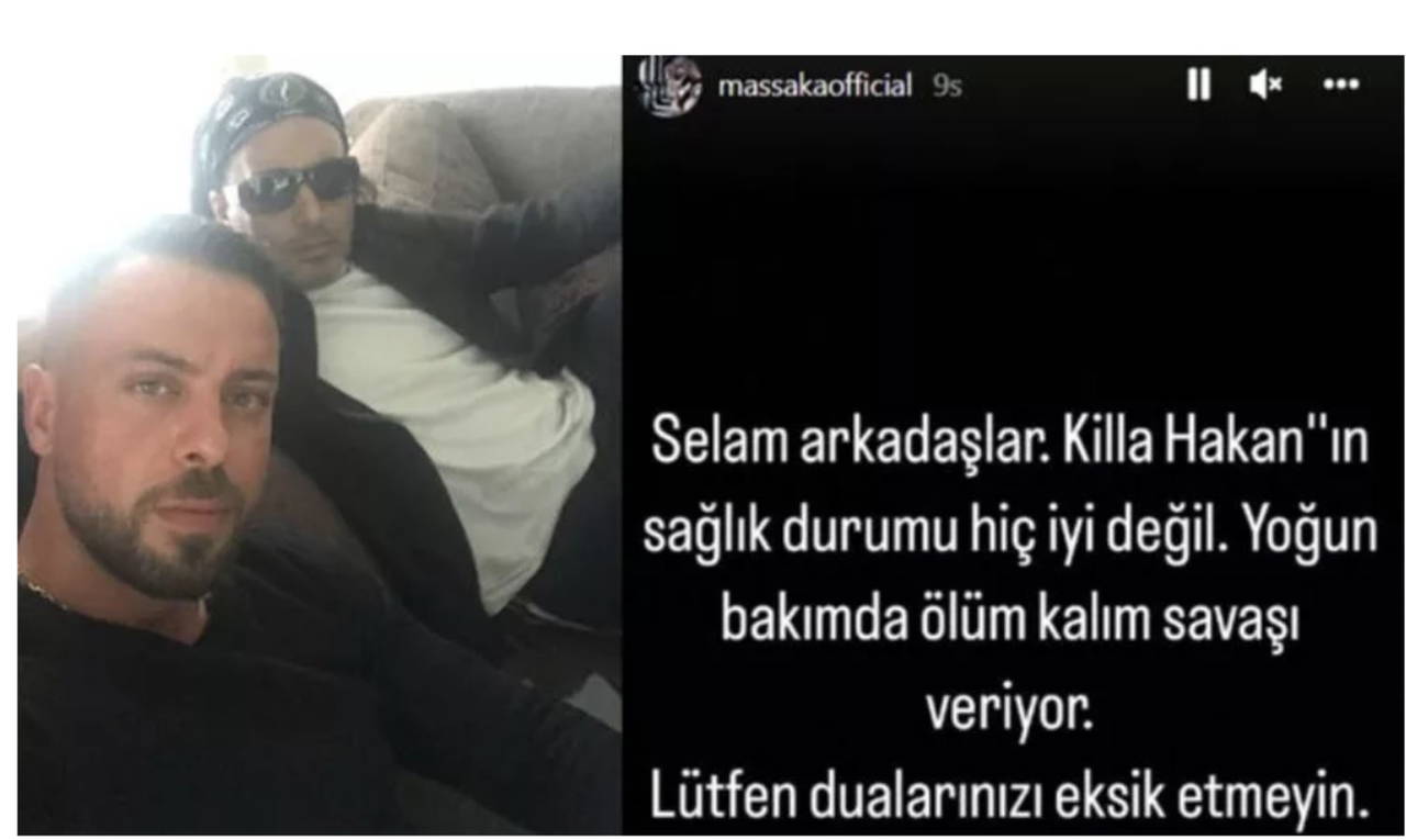 Rapçi Massaka, yaptığı paylaşımda, "Selam arkadaşlar. Killa Hakan'ın sağlık durumu hiç iyi değil. Yoğun bakımda ölüm kalım savaşı veriyor. Lütfen dualarınızı eksik etmeyin" dedi. Killa Hakan'ın neden yoğun bakımda olduğu ise henüz açıklanmadı.