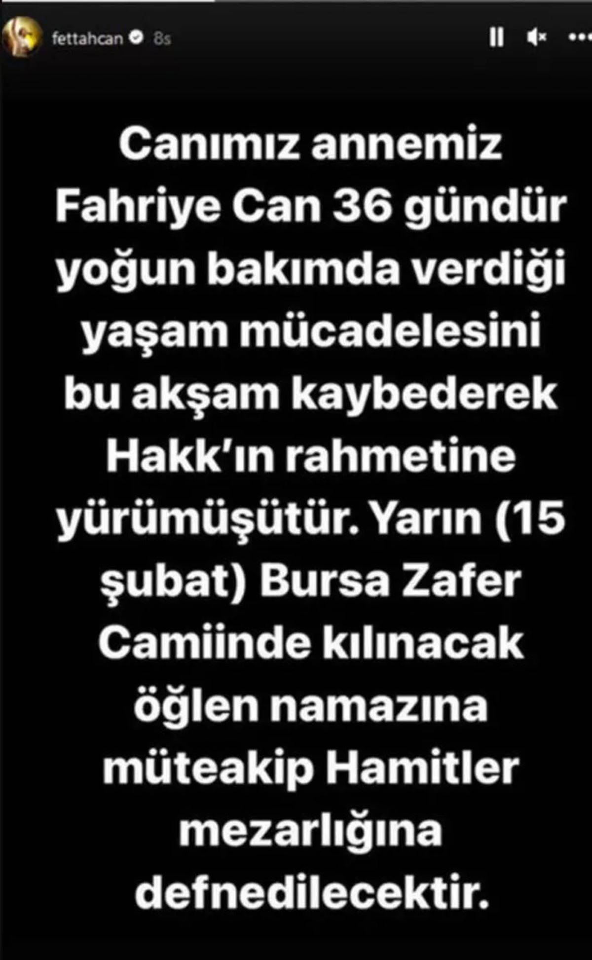 Konuyla alakalı açıklamada bulunan Fettah Can, "Canımız annemiz Fahriye Can, 36 gündür yoğun bakımda verdiği yaşam mücadelesini kaybederek Hakk’ın rahmetine yürümüştür" dedi.