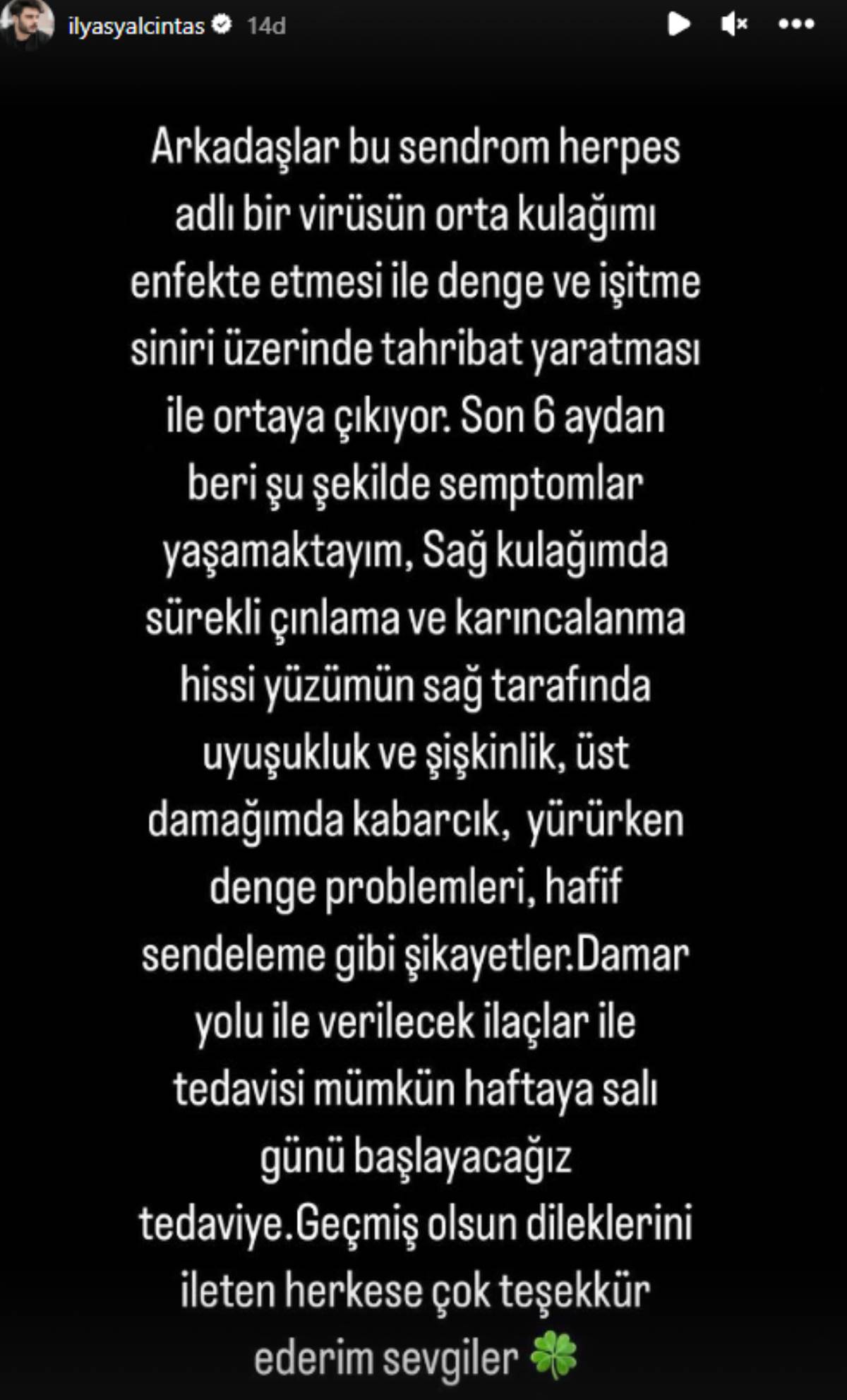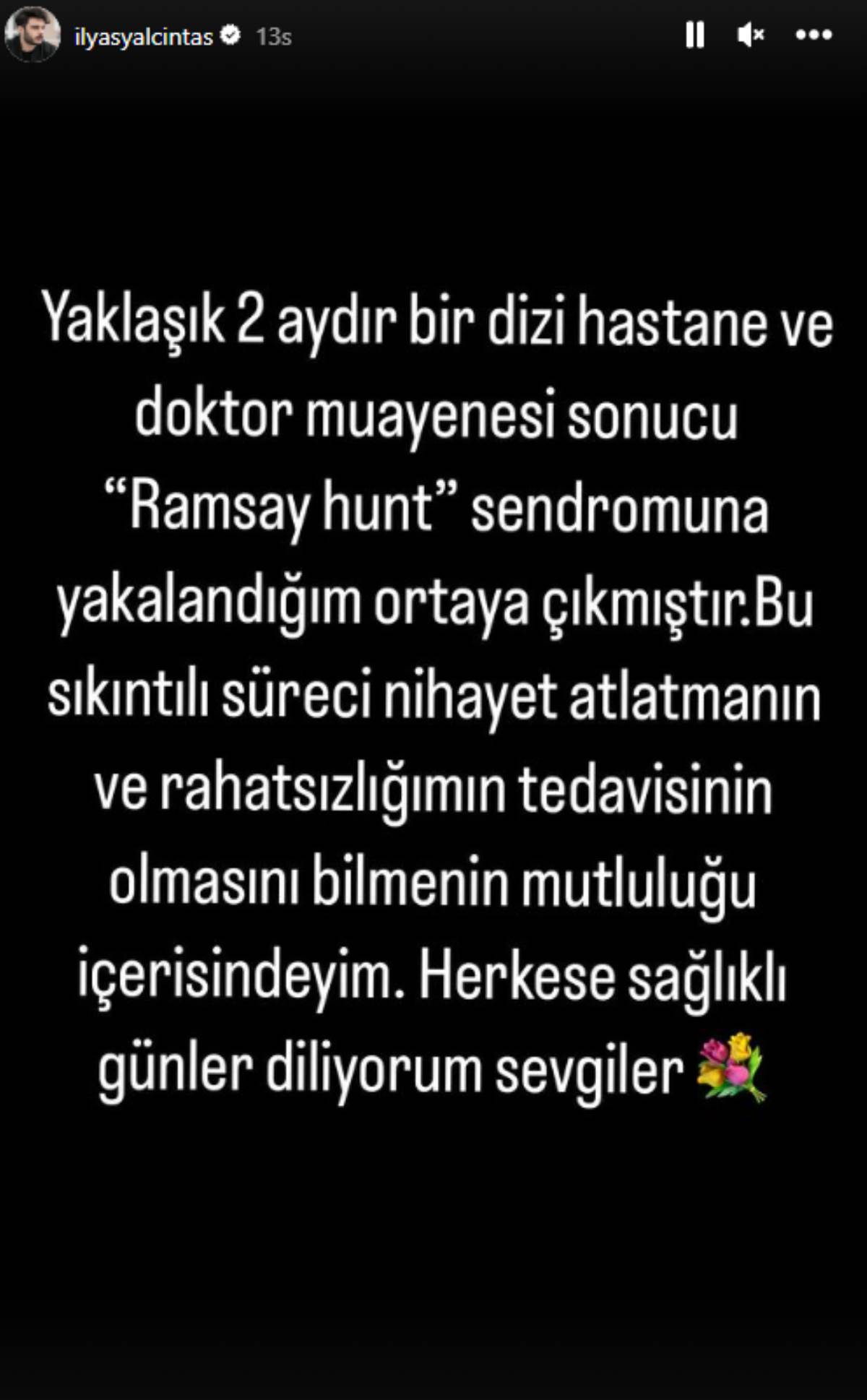 "Yaklaşık 2 aydır bir dizi hastane ve doktor muayenesi sonucu "Ramsay Hunt" sendromuna yakalandığım ortaya çıkmıştır. Bu sıkıntılı süreci nihayet atlatmanın ve rahatsızlığımın tedavisinin olmasını bilmenin mutluluğu içerisindeyim. Herkese sağlıklı günler diliyorum, sevgiler.