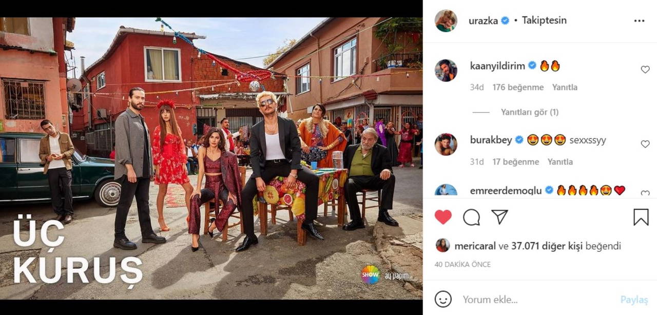 Üç Kuruş'ta Kartal karakterine hayat verecek olan Uraz Kaygılaroğlu da, dizinin afişini sosyal medya hesabından paylaştı. Kaygılaroğlu'nun paylaşımı kısa sürede çok sayıda beğeni ve yorum aldı.