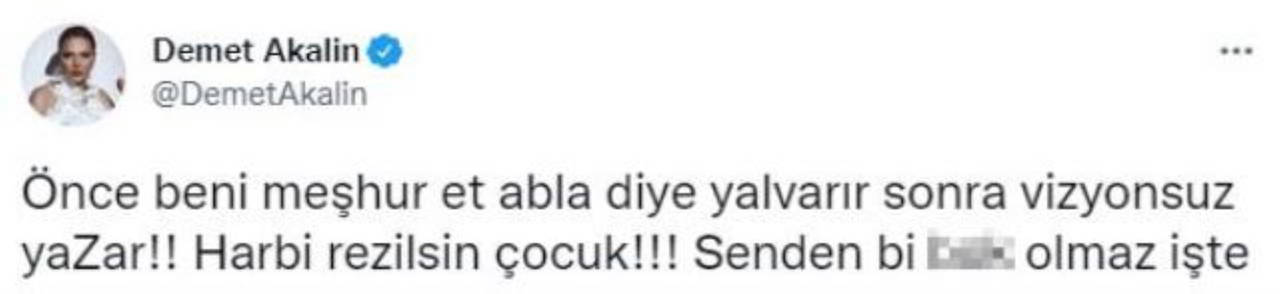 Bu paylaşımı görünce sinirlenen Akalın ise "Önce beni meşhur et abla diye yalvarır daha sonra vizyonsuz yazar! Harbi rezilsin çocuk! Senden bir b... olmaz işte" yazdı.