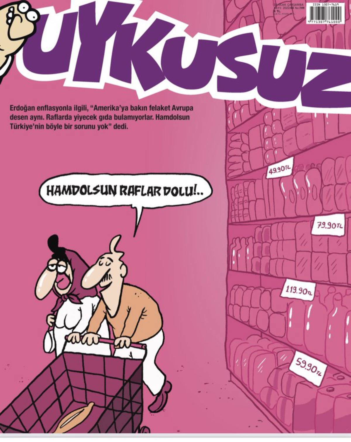 Uykusuz, rafları dolu olan bir markette sepetlerinde sadece ekmek olan çifti çizdi. Dergi, Erdoğan'ın açıklamalarını, 'hamdolsun raflar dolu!' sözleriyle tiye aldı.