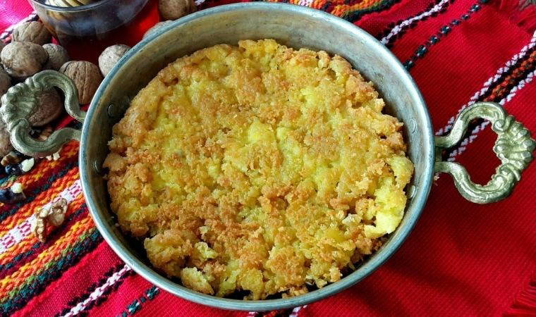 Yumurtaları tuzla birlikte ayrı bir kasede çırpın ve tavadaki unlu terayağına ilave edin. Hafifçe karıştırın ve güzelce pişirin.