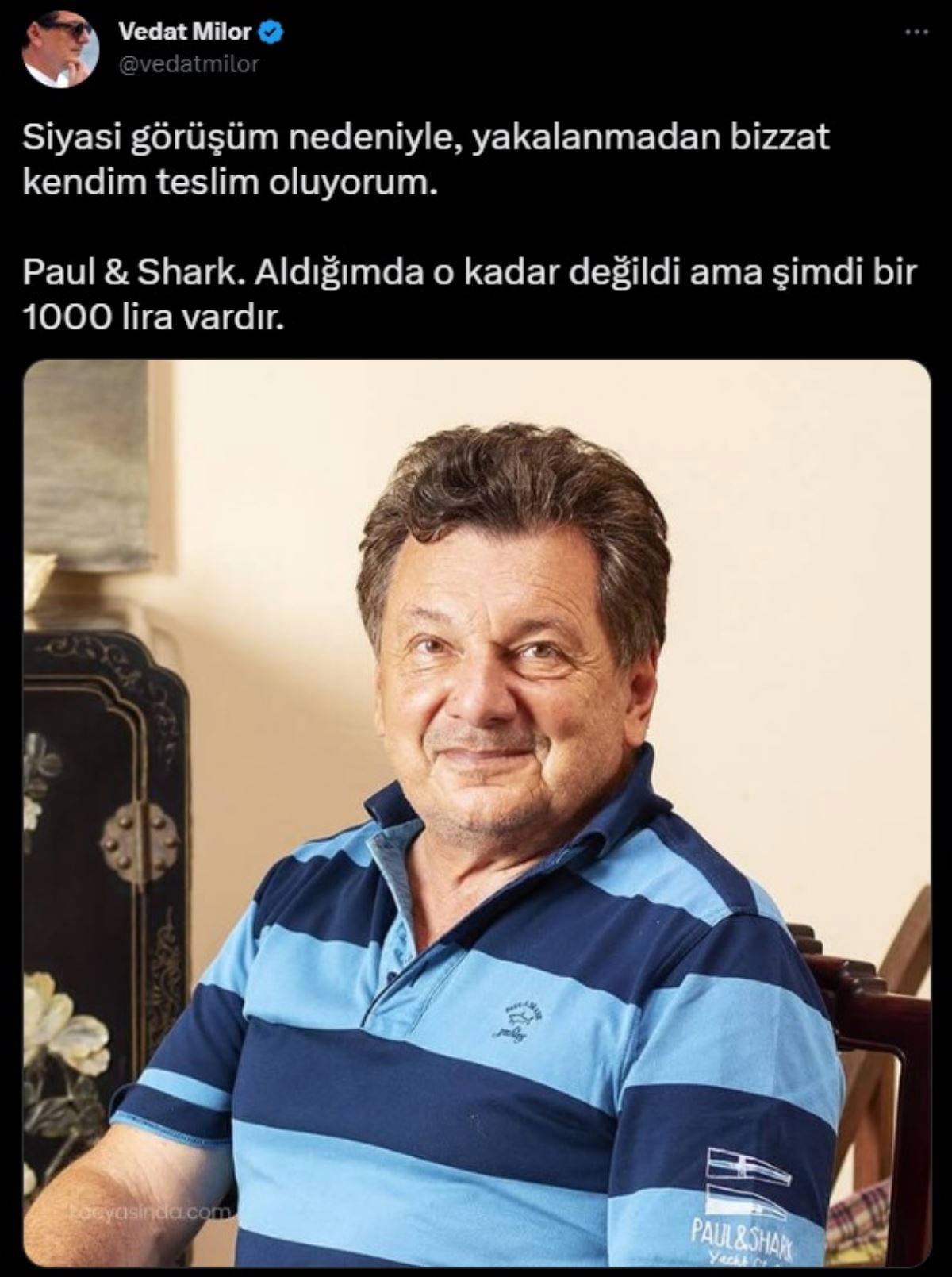 Milor, "Siyasi görüşüm nedeniyle, yakalanmadan bizzat kendim teslim oluyorum. Paul & Shark. Aldığımda o kadar değildi ama şimdi bir 1000 lira vardır" ifadelerini kullandı.