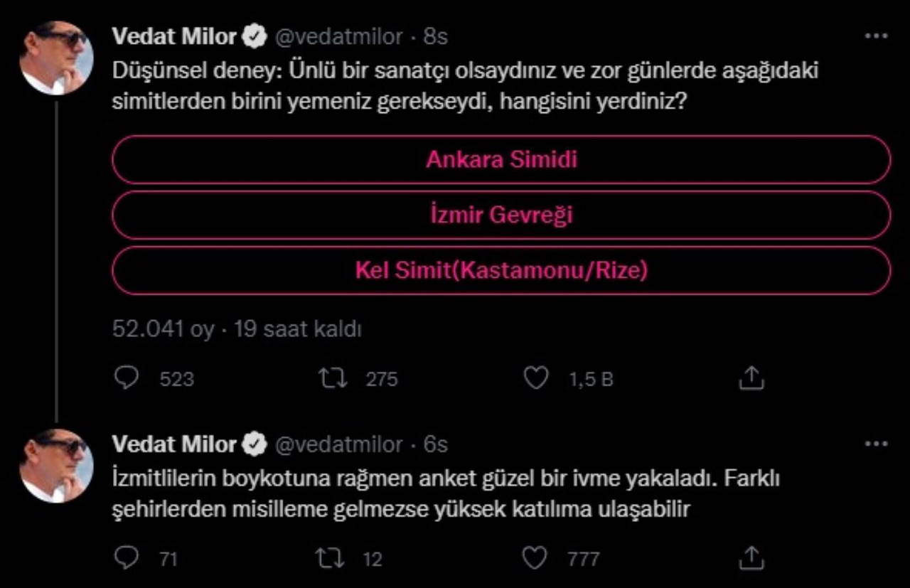 Sık sık sosyal medya hesabından anketler yapan gastronomi yazarı Vedat Milor, bu kez şarkıcı ve oyuncu Hülya Avşar’ın gündem olan “Gerekirse simit yenecek” açıklamasının ardından yeni bir anket açtı.