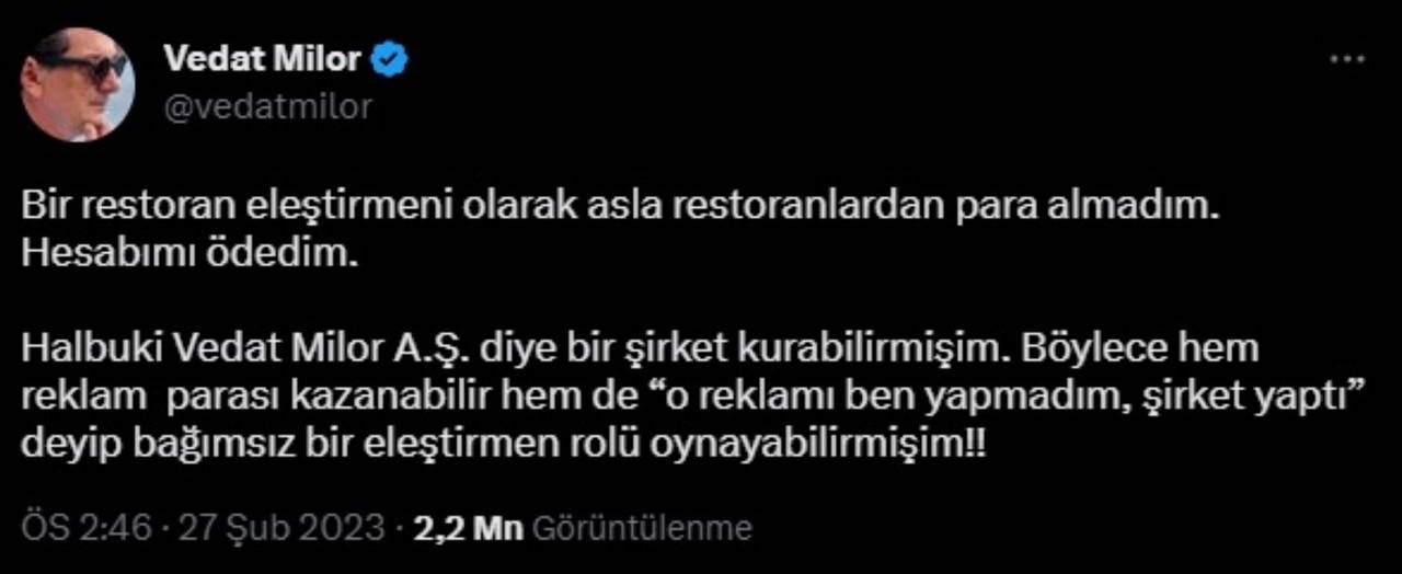 Kınık'ın bu açıklamasının gündem olmasının ardından; ünlü gastronomi yazarı ve yemek eleştirmeni Vedat Milor, kişisel Twitter hesabından bir paylaşımda bulundu.