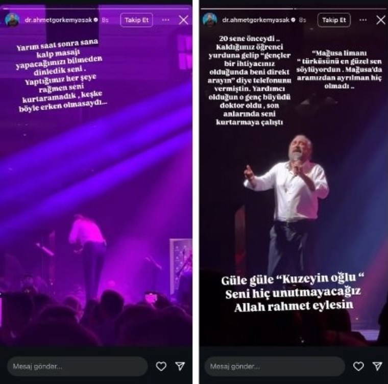 Konserde çektiği videoya duygusal bir not ekleyen Yasak, "20 sene önceydi... Kaldığımız öğrenci yurduna gelip 'Gençler, bir şeye ihtiyacınız olduğunda beni direkt arayın' diye telefonunu vermiştin. Yardımcı olduğun o genç büyüdü, doktor oldu; son anlarında seni kurtarmaya çalıştı" ifadelerini kullandı.