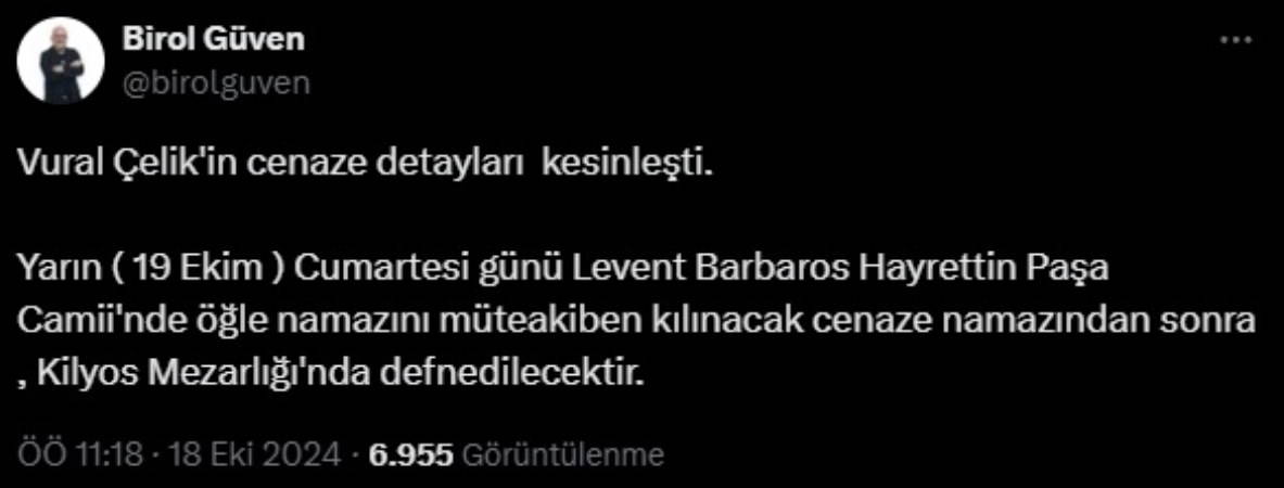 "Vural Çelik'in cenaze detayları kesinleşti. Yarın (19 Ekim) Cumartesi günü Levent Barbaros Hayrettin Paşa Camii'nde öğle namazını müteakiben kılınacak cenaze namazından sonra, Kilyos Mezarlığı'nda defnedilecektir."