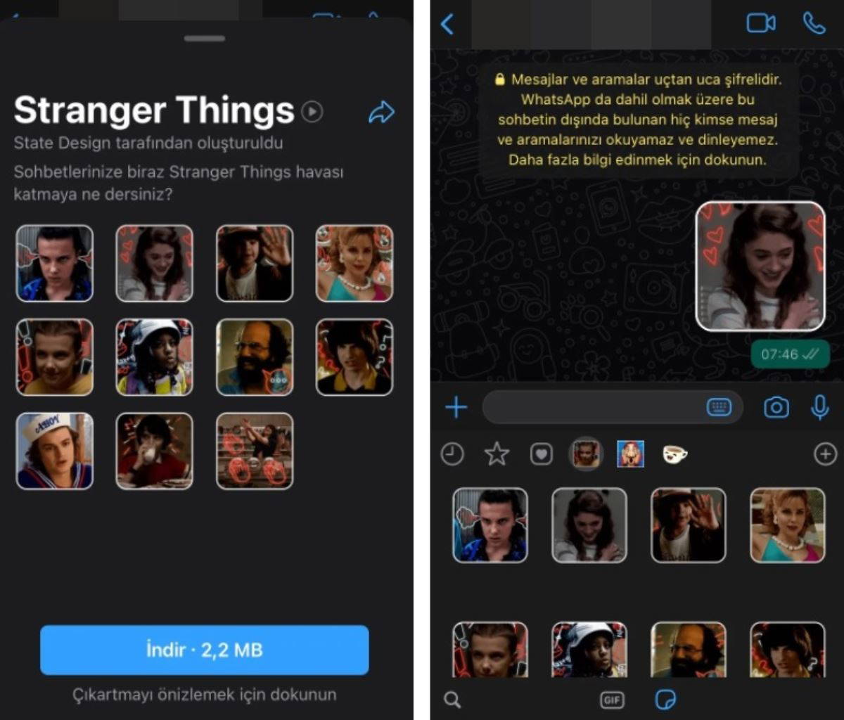 2,2 MB’lık paketi indirmenin iki yolu mevcut. Buradaki linke tıklayarak doğrudan WhatsApp’ın resmi çıkartma mağazasından indirebilirsiniz. Alternatif olarak sohbetlerdeki çıkartma işlevinde “+” simgesine dokunarak Stranger Things kelimesini aratabilir ve dizinin ikonik karakterlerinin bulunduğu görsellere erişebilirsiniz.