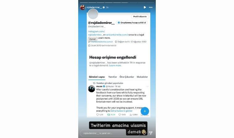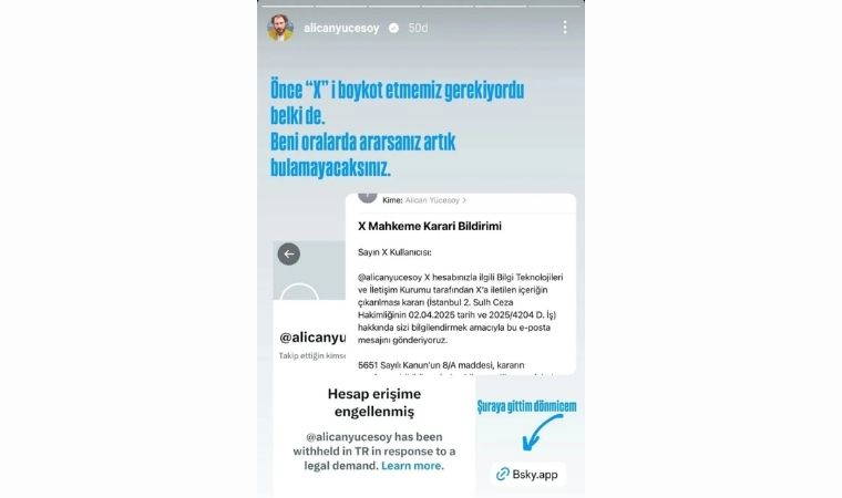 Instagram hesabından paylaşım yapan Rojda Demirer “Twitlerim amacına ulaşmış demek” yazarken Alican Yücesoy da “Önce X’i boykot etmemiz gerekiyordu belki de” yazdı.
