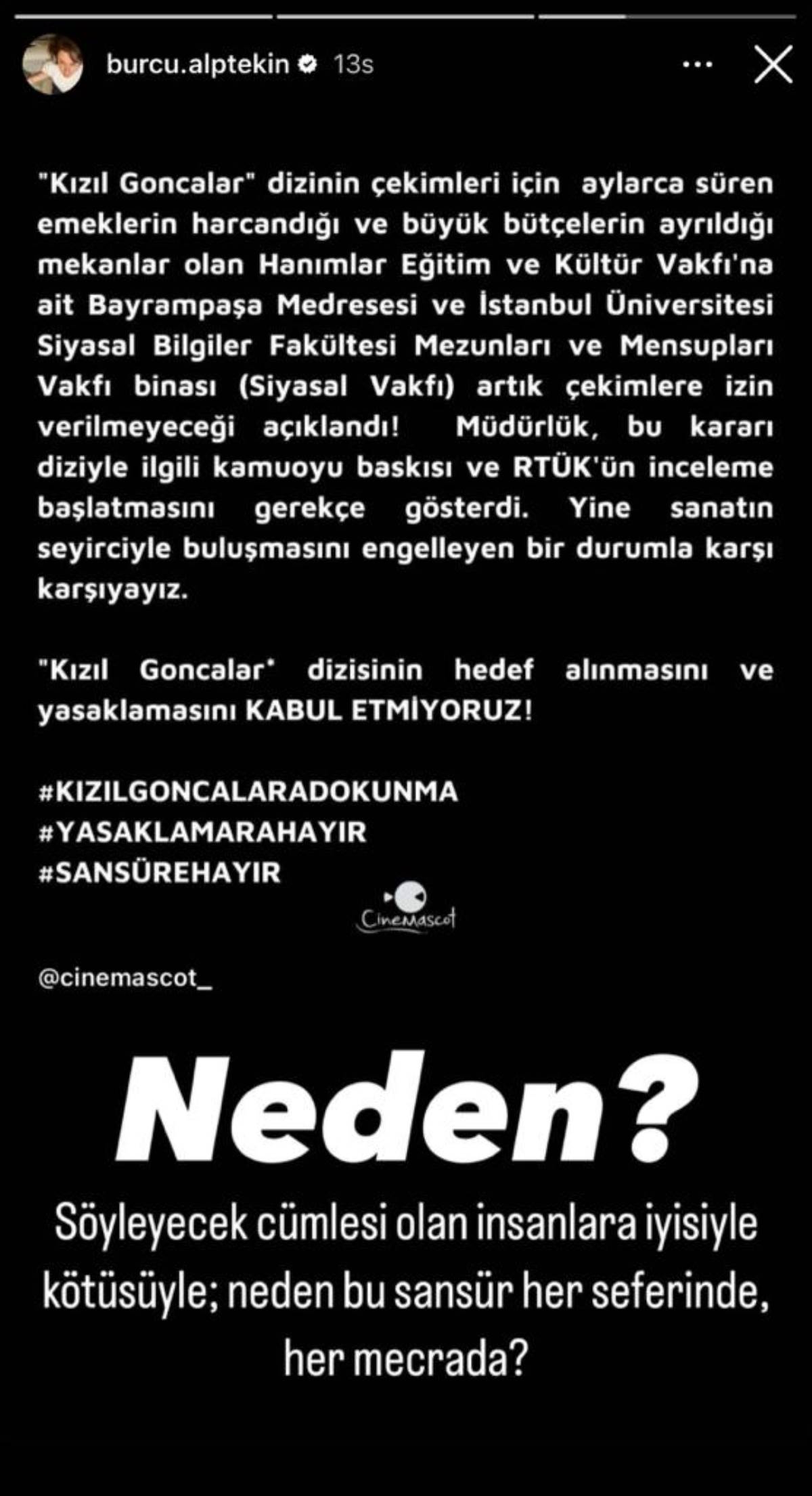 Alptekin yayınladığı mesajda Cinemascot'un açıklamasını alıntılayarak, "Neden? Söyleyecek cümlesi olan insanlara iyisiyle kötüsüyle; neden bu sansür her seferinde, her mecrada?" ifadelerini kullandı.