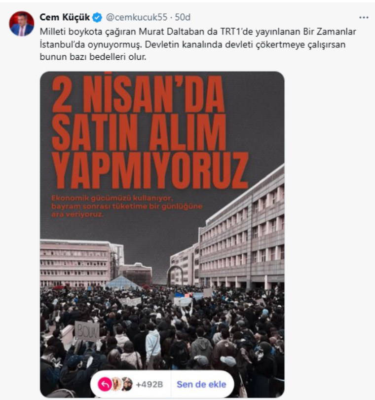 “Milleti boykota çağıran Murat Daltaban da TRT1’de yayınlanan Bir Zamanlar İstanbul’da oynuyormuş. Devletin kanalında devleti çökertmeye çalışırsan bunun bazı bedelleri olur.”