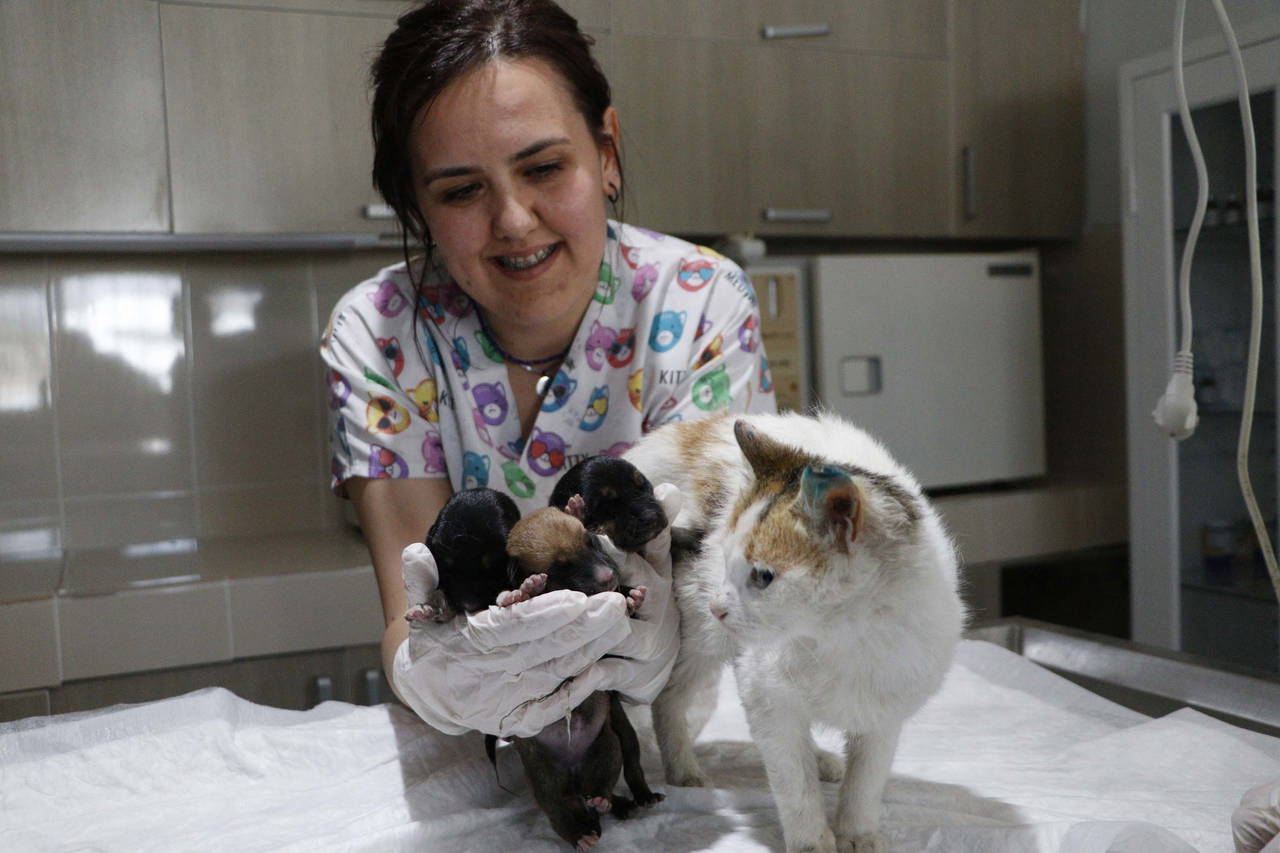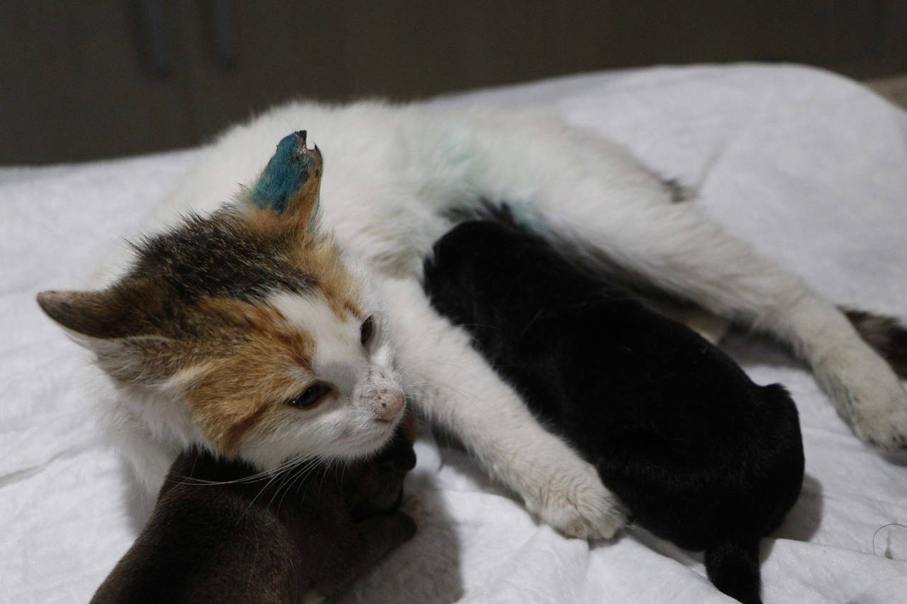 Duyuru üzerine ölü doğum yapan bir sokak kedisi hayvanseverler tarafından merkeze ulaştırıldı. Kedi, sağlık kontrolü yapılıp, kısırlaştırılarak yavru köpeklerle buluşturuldu. Kedi, yavru köpekleri emzirmeye başladı.