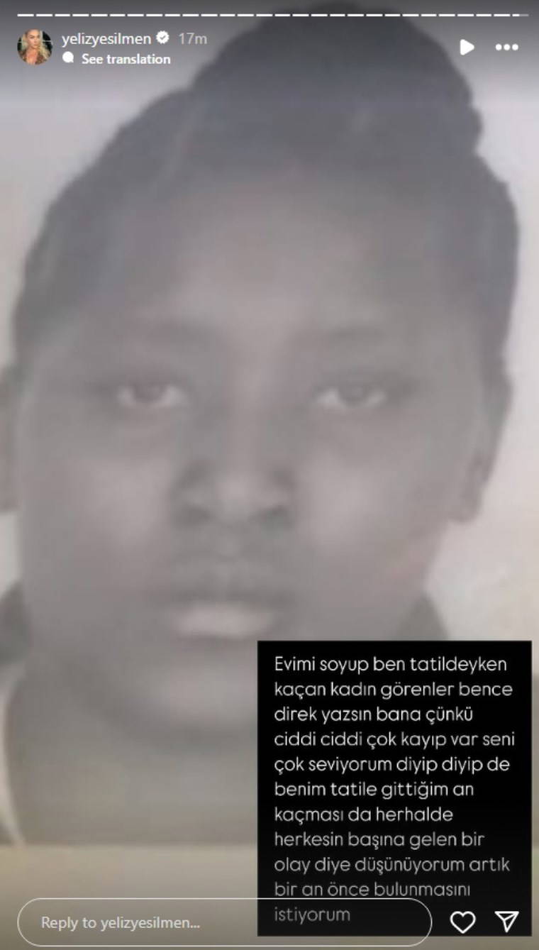 "Evimi soyup ben tatildeyken kaçan kadın, görenler lütfen bana yazsın çünkü ciddi ciddi çok kayıp var. ‘Seni çok seviyorum’ deyip, benim tatile gittiğim anda kaçması herkesin başına gelebilecek bir olay diye düşünüyorum. Artık bir an önce bulunmasını istiyorum."