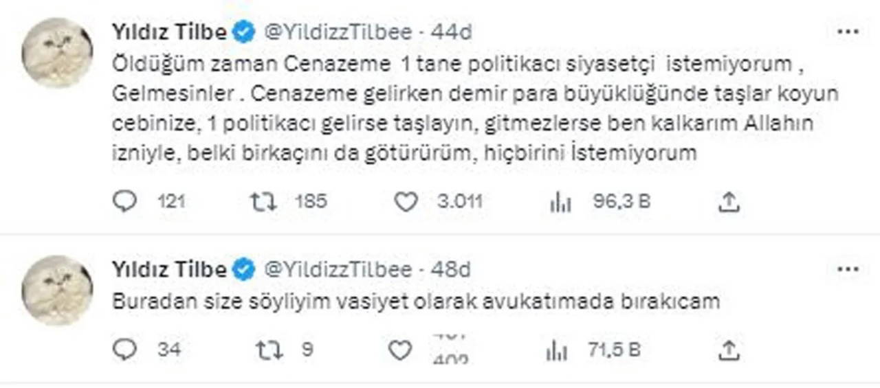 Twitter hesabından paylaşım yapan Yıldız Tilbe, "Allah hepinize sağlıklı uzun ömürler versin. Buradan size söyleyeyim vasiyet olarak avukatıma da bırakacağım. Öldüğüm zaman cenazeme 1 tane politikacı, siyasetçi istemiyorum, gelmesinler. Cenazeme gelirken demir para büyüklüğünde taşlar koyun cebinize, 1 politikacı gelirse taşlayın. Gitmezlerse ben kalkarım Allah'ın izniyle, belki birkaçını da götürürüm. Hiçbirini İstemiyorum" ifadelerini kullandı.