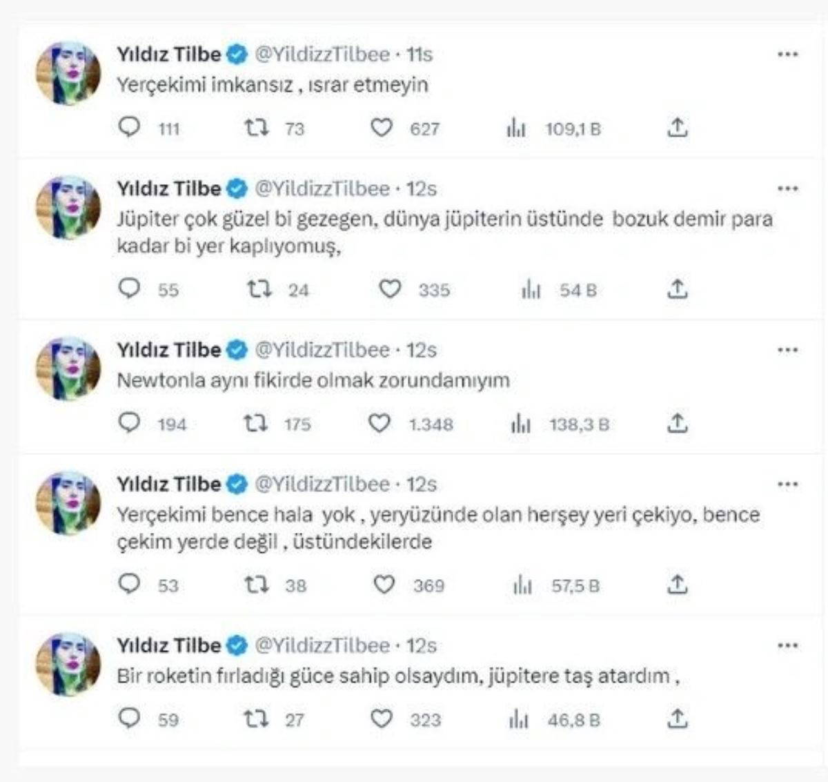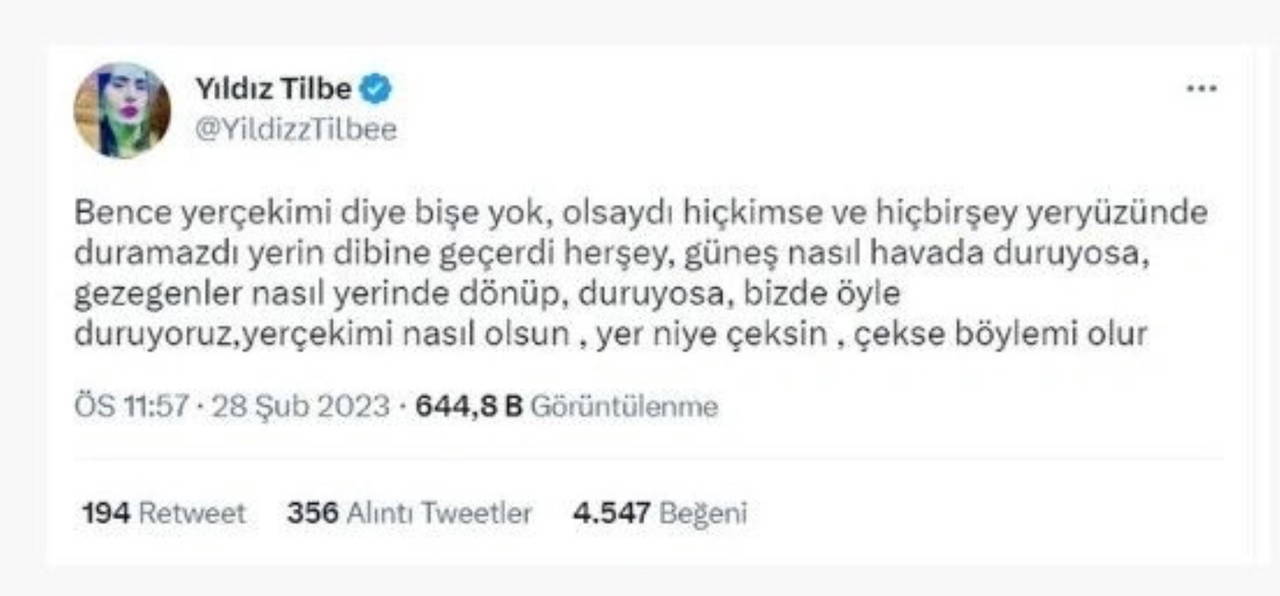 Twitter üzerinden paylaşımda bulunan Tilbe, "Bence yer çekimi diye bir şey yok, olsaydı hiç kimse ve hiçbir şey yeryüzünde duramazdı, yerin dibine geçerdi" dedi.