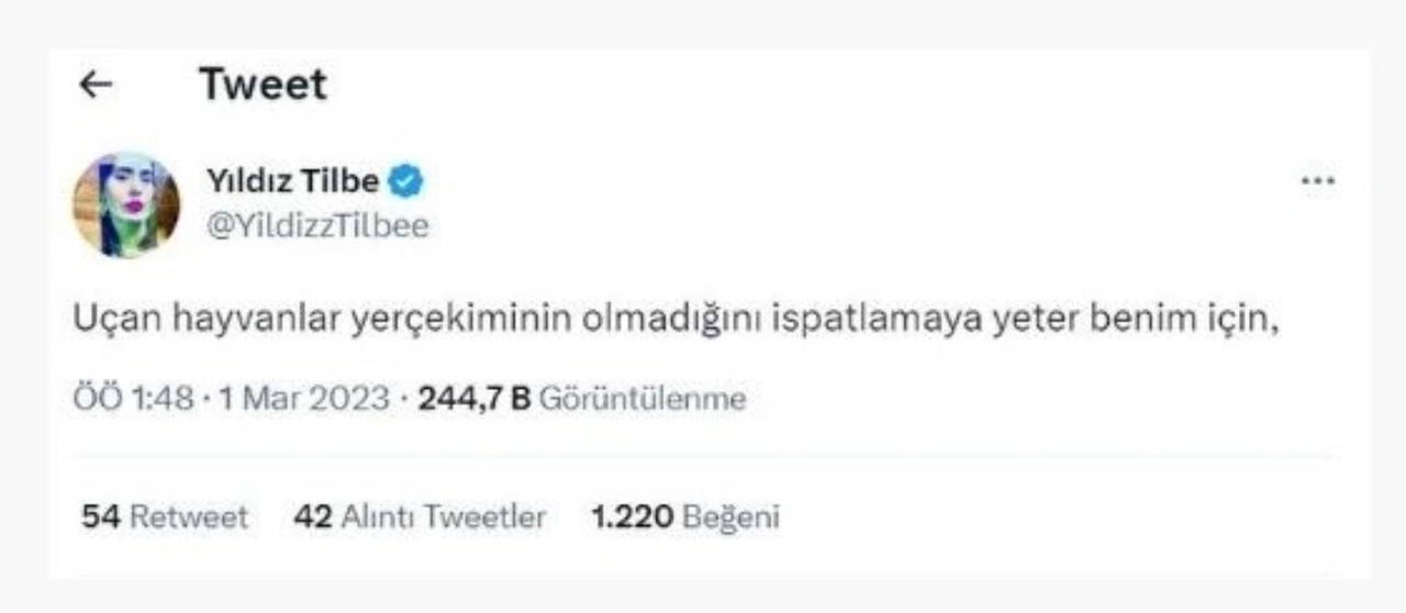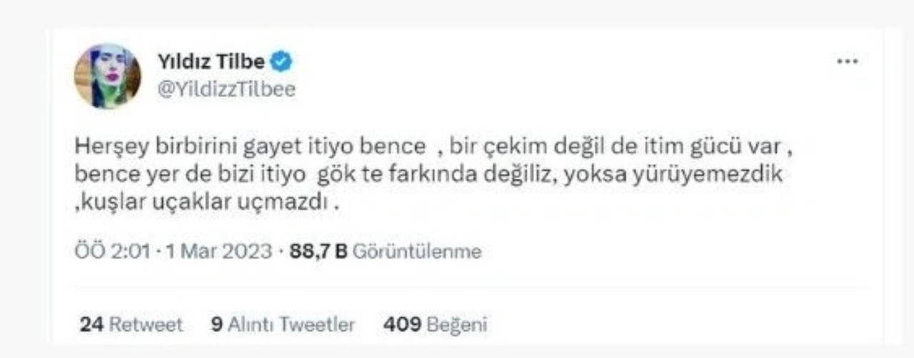 Tilbe, yer çekiminin değil ancak itim gücünün olduğunu iddia ederek paylaştığı tweetinde ise "Her şey birbirini gayet itiyor bence, bir çekim değil de itim gücü var. Bence yer de bizi itiyor, gök de. Farkında değiliz, yoksa yürüyemezdik. Kuşlar, uçaklar uçmazdı" ifadelerini kullandı.