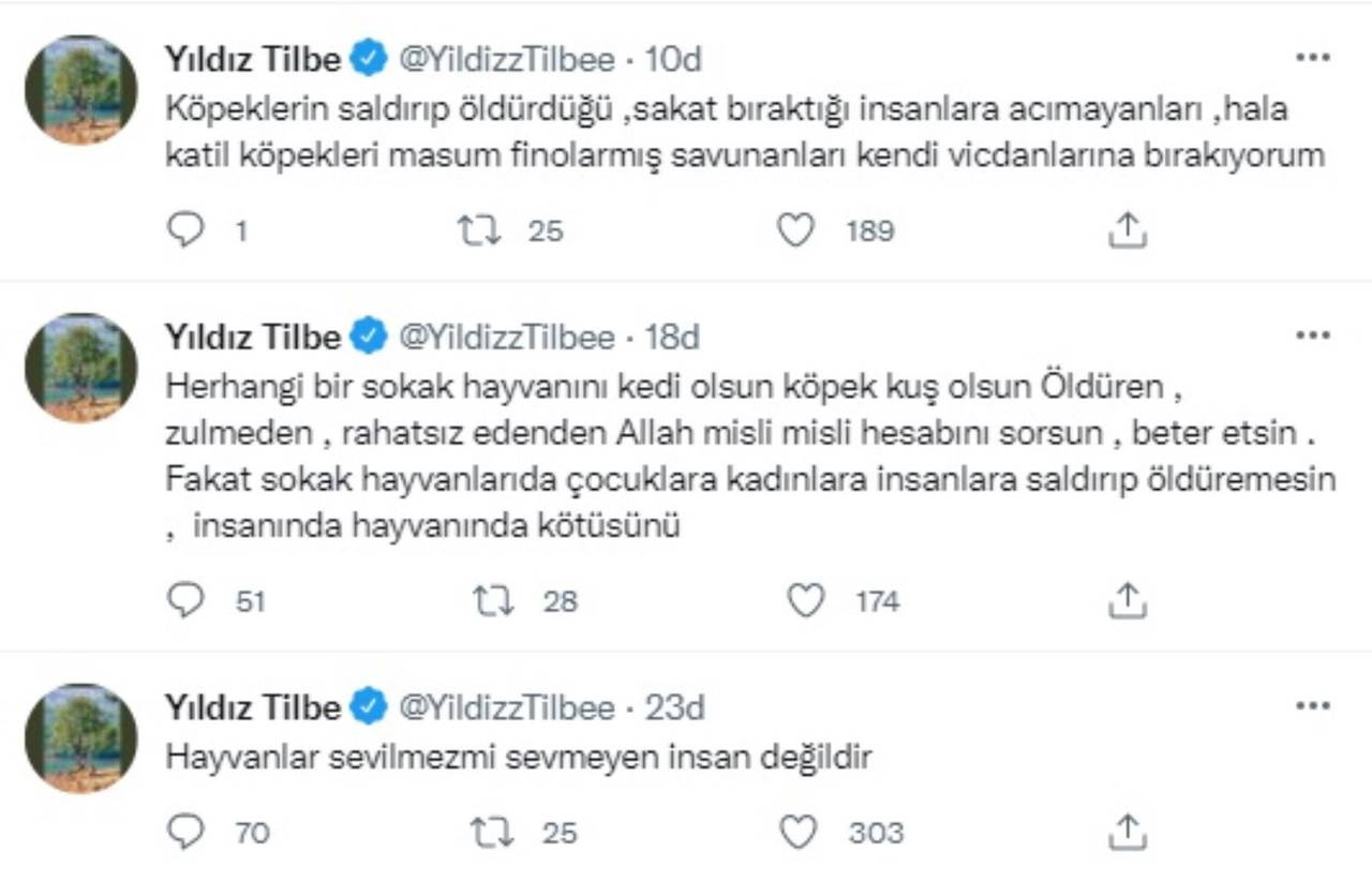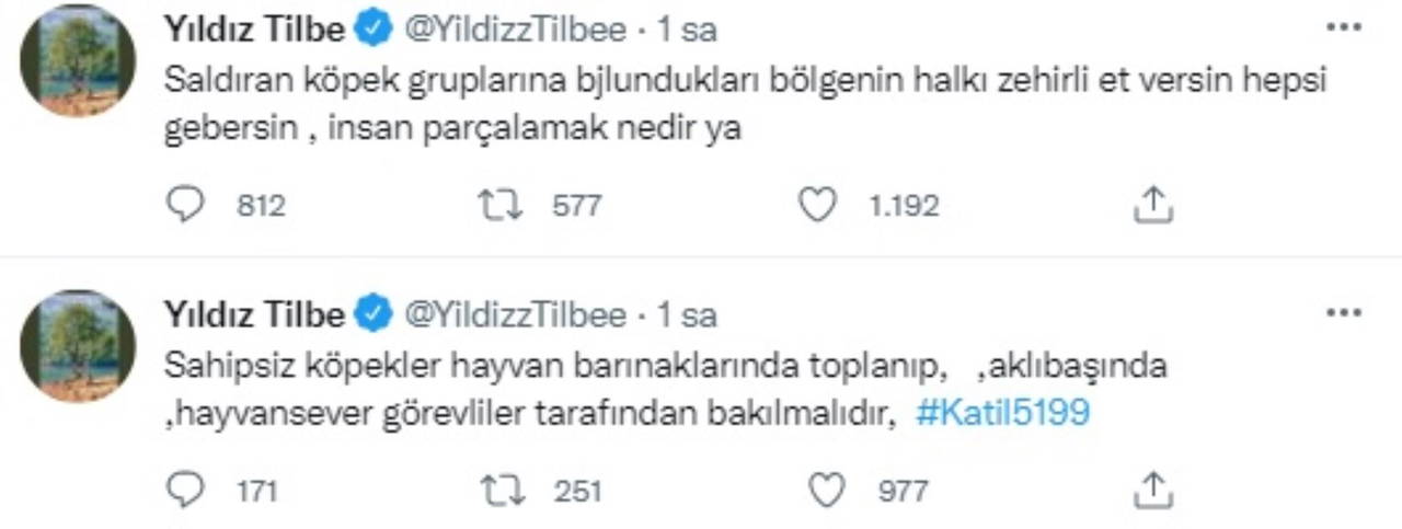 Twitter hesabından paylaşımlarda bulunan Yıldız Tilbe, "Sahipsiz köpekler hayvan barınaklarında toplanıp aklı başında, hayvansever görevliler tarafından bakılmalıdır. Saldıran köpek gruplarına bulundukları bölgenin halkı zehirli et versin hepsi gebersin, insan parçalamak nedir ya? Toplasınlar hayvan barınaklarına köpekleri, hayvanseverler görevlendirilsin, hayvan sevmeyen sırf görev diye bu işi yapan birileri olmasın barınaklardaki hayvanlar birbirini yiyor açlıktan Allah razı olmasın, hayvanseverler görevlendirilsin, kontrol edilsin hayvan da kurtulsun insan da” ifadelerini kullandı.
