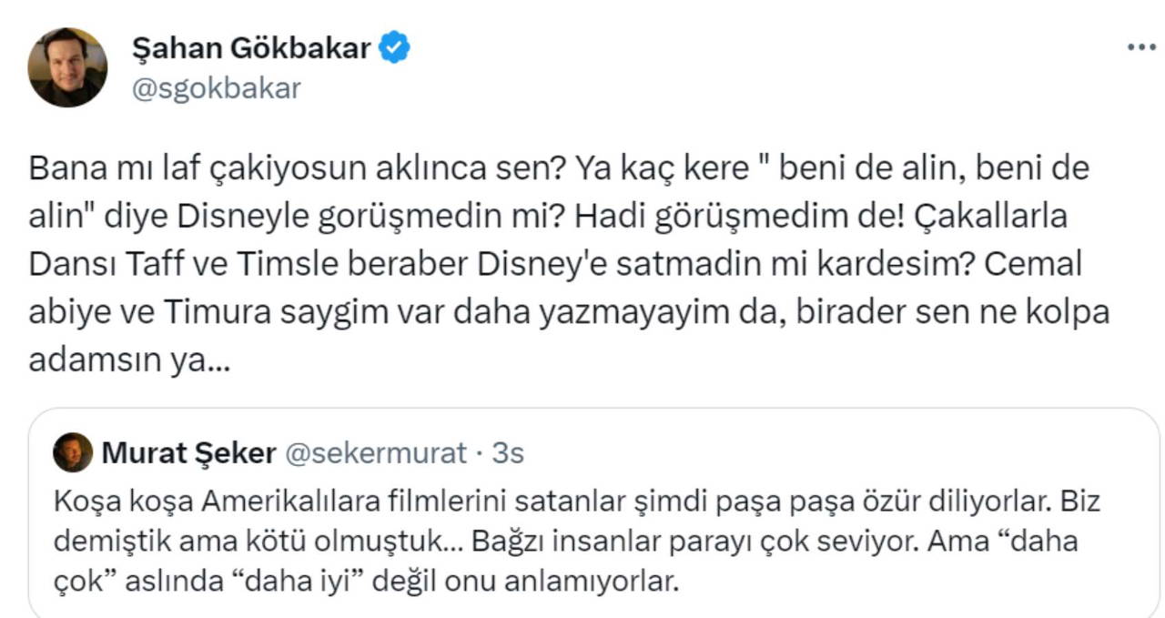 Disney için bir de dizi projesi çeken Gökbakar’ın özür paylaşımının ardından yönetmen Murat Şeker, "Koşa koşa Amerikalılara filmlerini satanlar şimdi paşa paşa özür diliyorlar. Biz demiştik ama kötü olmuştuk… Bağzı insanlar parayı çok seviyor" dedi.