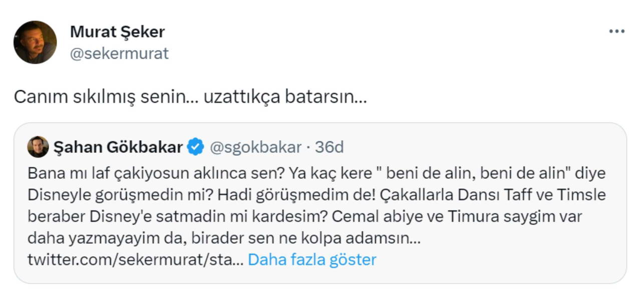 Şeker'in sözlerine tepki gösteren Gökbakar, "Bana mı laf çakıyorsun aklınca sen? Ya kaç kere ‘Beni de alın, beni de alın’ diye Disney’le görüşmedin mi? Hadi görüşmedim de! Çakallarla Dansı Taff ve Tim’sle beraber Disney’e satmadın mı kardeşim? Cemal (Okan) abiye ve Timur’a (Savcı) saygım var daha yazmayayım da, birader sen ne kolpa adamsın ya…" ifadelerini kullandı.