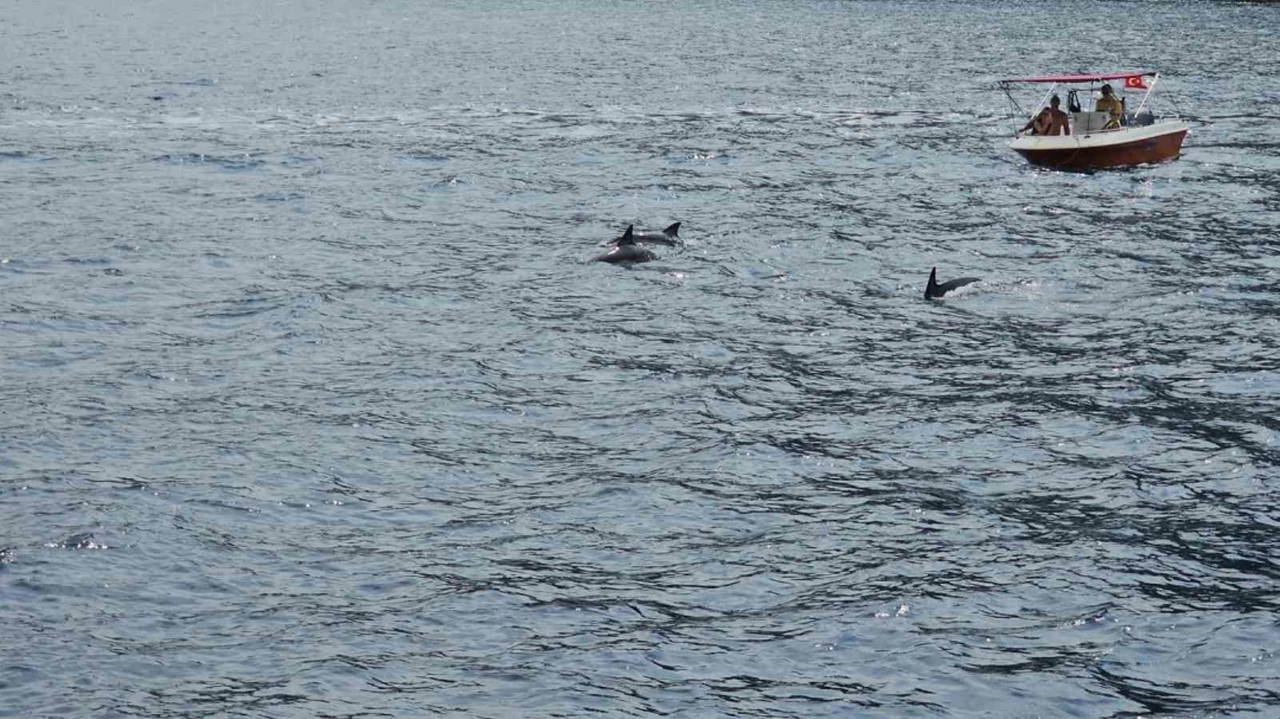 Sabah erken saatlerde Güzelçamlı’dan hareket eden ve Kuşadası’nın dünyaca ünlü Milli Park koylarında denize giren tatilciler, öğle saatlerinde tekne hareket halindeyken rast geldikleri yaklaşık yarım saat kadar süren renkli anları cep telefonlarıyla kaydetti.