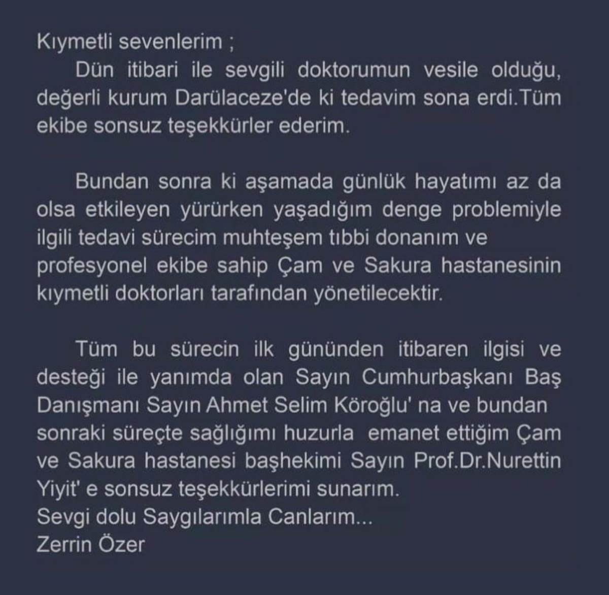 Son zamanlarda yaşadığı denge problemleri nedeniyle Başakşehir Çam ve Sakura Şehir Hastanesi’nde tedavi altına alınan Özer, sağlık durumu ile ilgili sosyal medya hesabından açıklama yaptı.