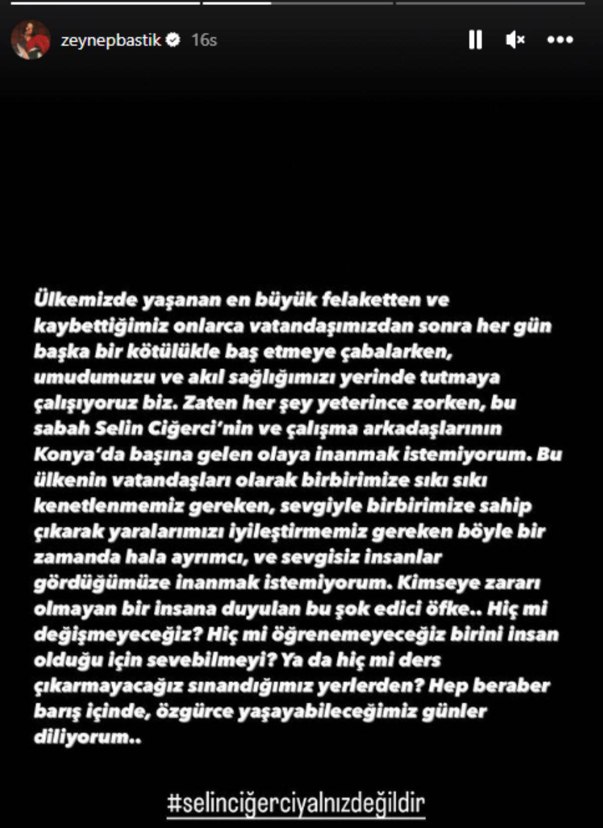 "Ülkemizde yaşanan en büyük felaketten ve kaybettiğimiz onlarca vatandaşımızdan sonra her gün başka bir kötülükle baş etmeye çabalarken, umudumuzu ve akıl sağlığımızı yerinde tutmaya çalışıyoruz biz. Zaten her şey yeterince zorken, bu sabah Selin Ciğerci'nin ve çalışma arkadaşlarının Konya'da başına gelen olaya inanmak istemiyorum. Bu ülkenin vatandaşları olarak birbirimize sıkı sıkı kenetlenmemiz gereken, sevgiyle birbirimize sahip çıkarak yaralarımızı iyileştirmemiz gereken böyle bir zamanda hala ayrımcı, ve sevgisiz insanlar gördüğümüze inanmak istemiyorum. Kimseye zararı olmayan bir insana duyulan bu şok edici öfke... Hiç mi değişmeyeceğiz? Hiç mi öğrenemeyeceğiz birini insan olduğu için sevebilmeyi? Ya da hiç mi ders çıkarmayacağız sınandığımız yerlerden? Hep beraber barış içinde, özgürce yaşayabileceğimiz günler diliyorum..."