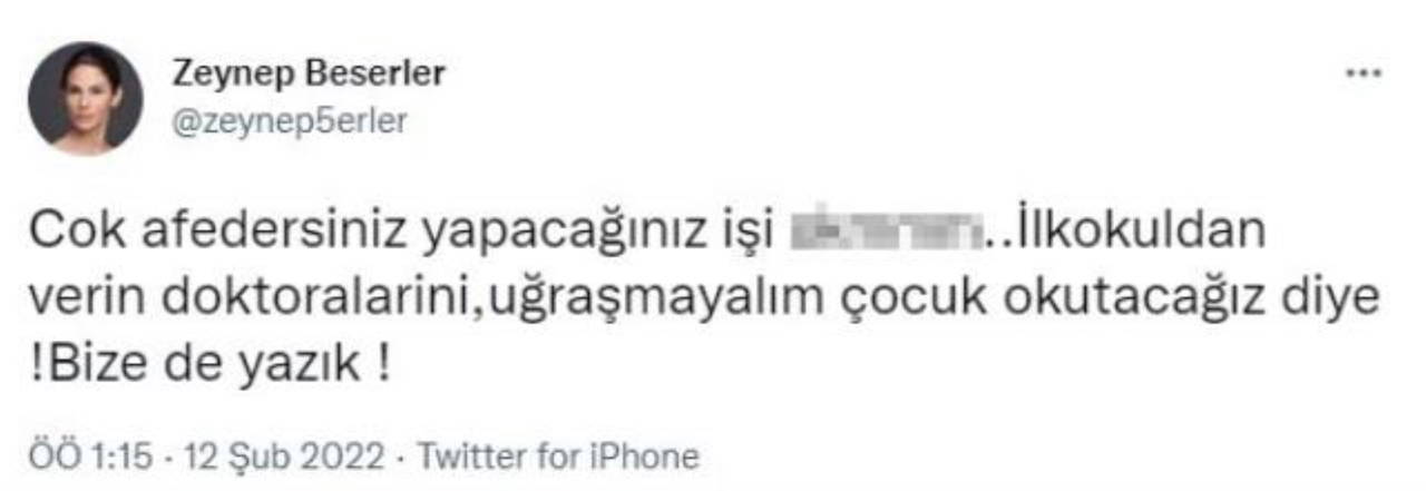 Beşerler, paylaşımında "Çok affedersiniz yapacağınız işi ....... İlkokuldan verin doktoralarını, uğraşmayalım çocuk okutacağız diye. Bize de yazık" ifadelerini kullandı.