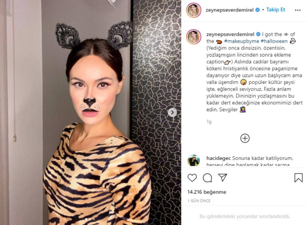 "Aslında Cadılar Bayramı kökeni Hristiyanlık öncesine, Paganizme dayanıyor diye uzun uzun başlayacağım ama vallahi üşendim. Popüler kültür şeyi işte. Eğlenceli, seviyoruz. Fazla anlam yüklemeyin. Dininizin yozlaşmasını bu kadar dert edeceğinize ekonomimizi dert edin. Sevgiler."