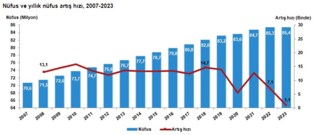 TÜİK, yıllık “Adrese Dayalı Nüfus Kayıt Sistemi Sonuçları, 2023” bültenini yayımladı (Covid-19 döneminde iki yıl dışında). Türkiye’de yerleşik (ikamet eden) nüfus, 31.12.2023’te 2022’ye göre yalnızca 92 bin 824 artarak 85 milyon 372 bin 377 kişi oldu. Nüfus artış hızı binde 1.1. Son 17 yılın verileri aşağıda.