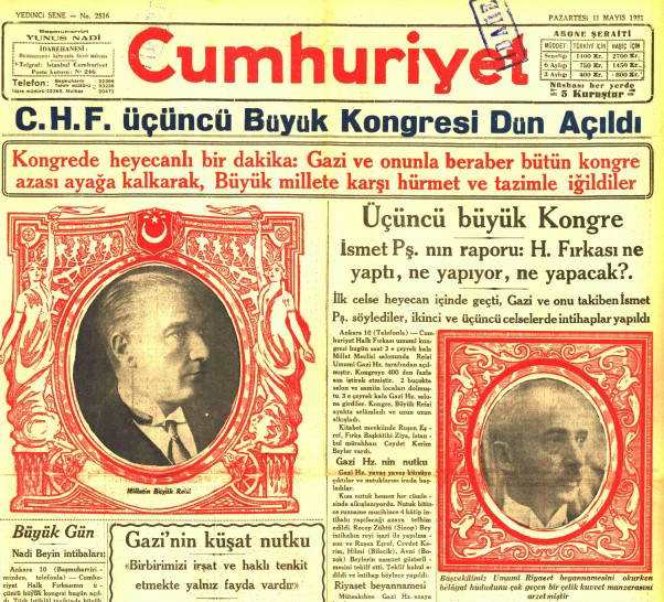 11 Mayıs 1931 tarihli Cumhuriyet gazetesi “CHP Üçüncü Büyük Kongresi Dün Açıldı” manşetiyle çıktı.