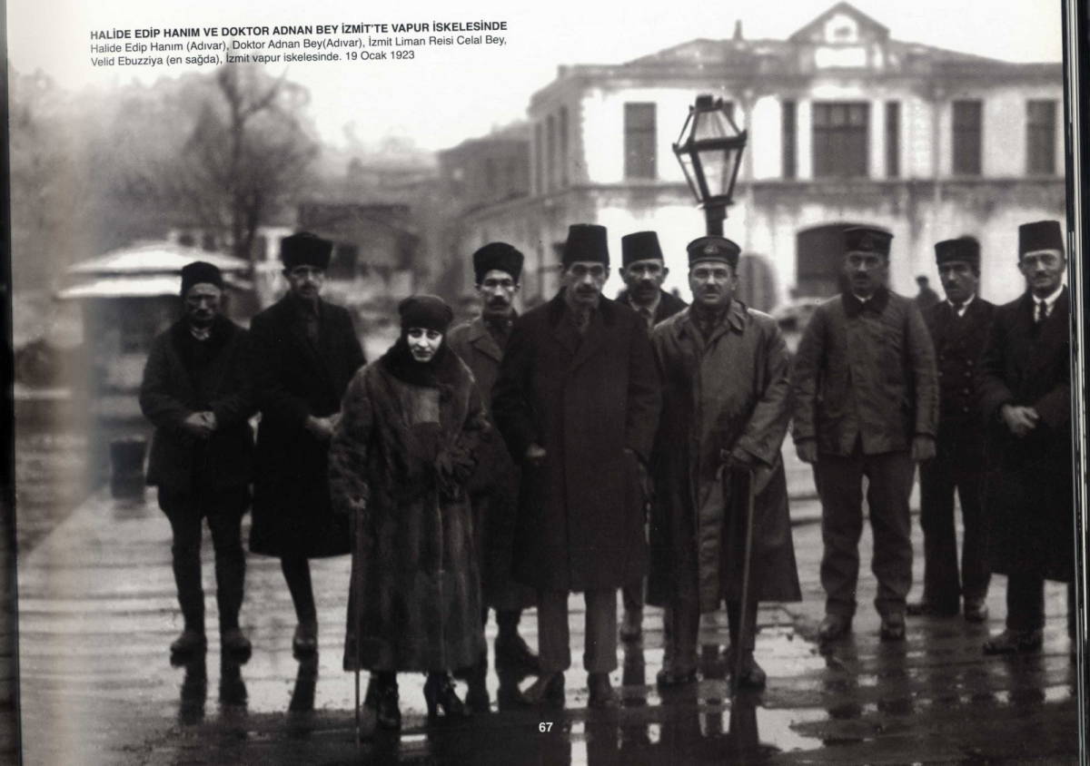 Halide Edib Hanım (Adıvar), Doktor Adnan Bey (Adıvar), İzmit Liman Reisi Celal Bey, Velid Ebüzziya (en sağda), İzmit vapur iskelesinde. 19 Ocak 1923