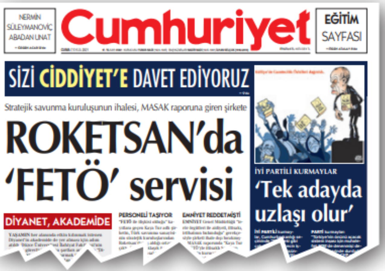 Muhabirimiz Sarp Sağkal’ın haberi manşette: “Roketsan’da FETÖ servisi...” Haberin ayrıntısı aynen şöyle: