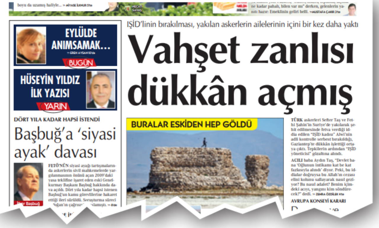 Cumhuriyet’in ikinci manşetinde çarpıcı bir başlık: “Vahşet zanlısı dükkân açmış!” Halk TV’den meslektaşımız İsmail Saymaz’ın haberiyle, “Türk askerleri Sefter Taş ve Fethi Şahin’in Suriye’de yakılarak şehit edilmesinde fetva verdiği iddia edilen ‘IŞİD kadısı’ Alwi’nin adli kontrolle serbest bırakıldığını, Gaziantep’te dükkân işlettiğini” öğrendik.