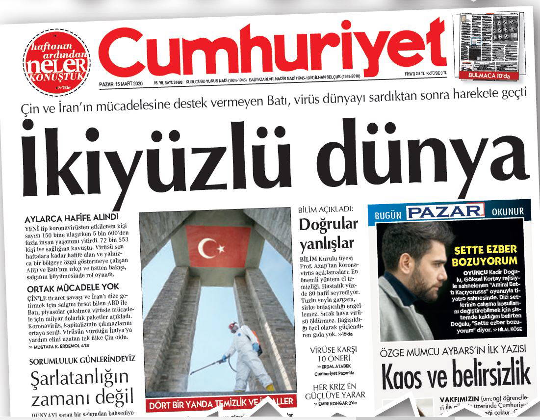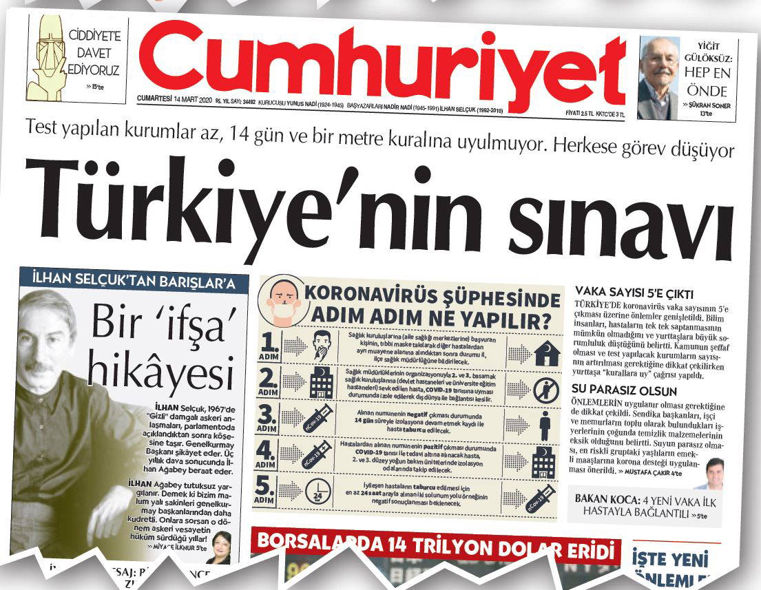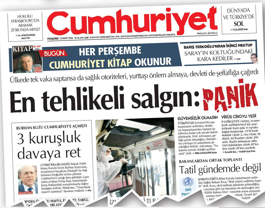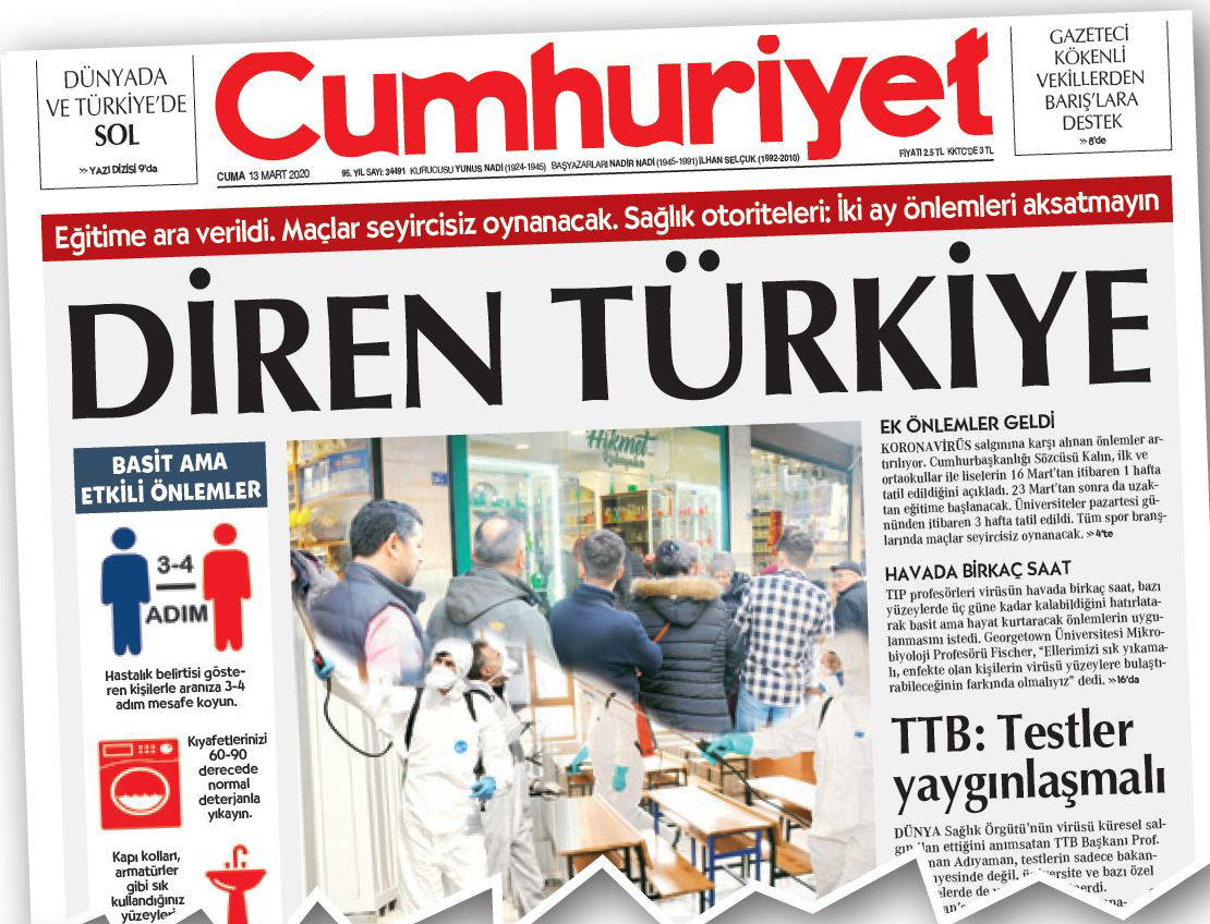 Yaşadığımız bu olayın, tecrübenin sadece iktidarın problemi olmadığının bilincindeyiz. Olumlu her çalışmayı kamuoyuna sunduk, sunacağız. Yanlış gördüğümüz konuları ise yine haber yapmaktan çekinmeyiz, uyarıcı görevimizi yerine getiririz. Bu süreçte “En tehlikeli salgın: Panik” başlığını da attık, “Diren Türkiye” manşetiyle iktidarıyla muhalefetiyle tüm ülkenin ortak bir çalışma yürütmesini istedik. Sağlıkla ilgili çok önemli meslek örgütlerinden ve önemli isimlerden ciddi “uyarılar” alıyoruz. Bunları şöyle sıralayabiliriz: