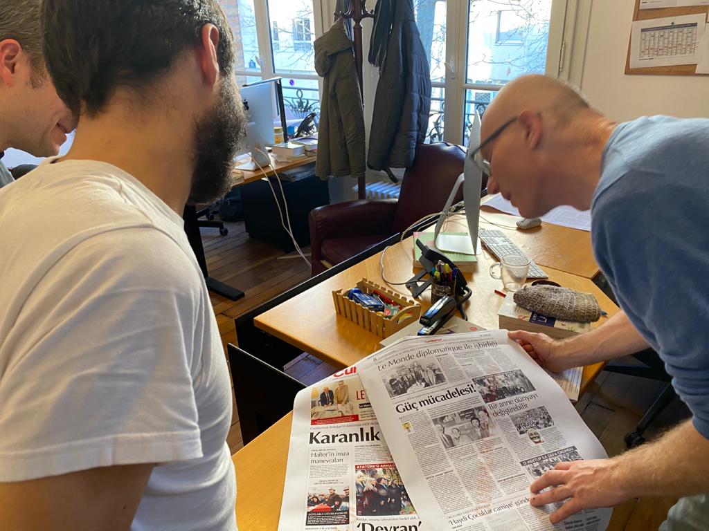 Cumhuriyet’in, Le Monde diplomatique ile işbirliğini duyuran manşet haberi ve sayfaları, gazetenin Paris’teki merkezinde ilgiyle karşılandı. Gazete çalışanları, 15 Ocak 2020 tarihli Cumhuriyet’te çıkan haber ve fotoğrafları dikkatle incelerken.
