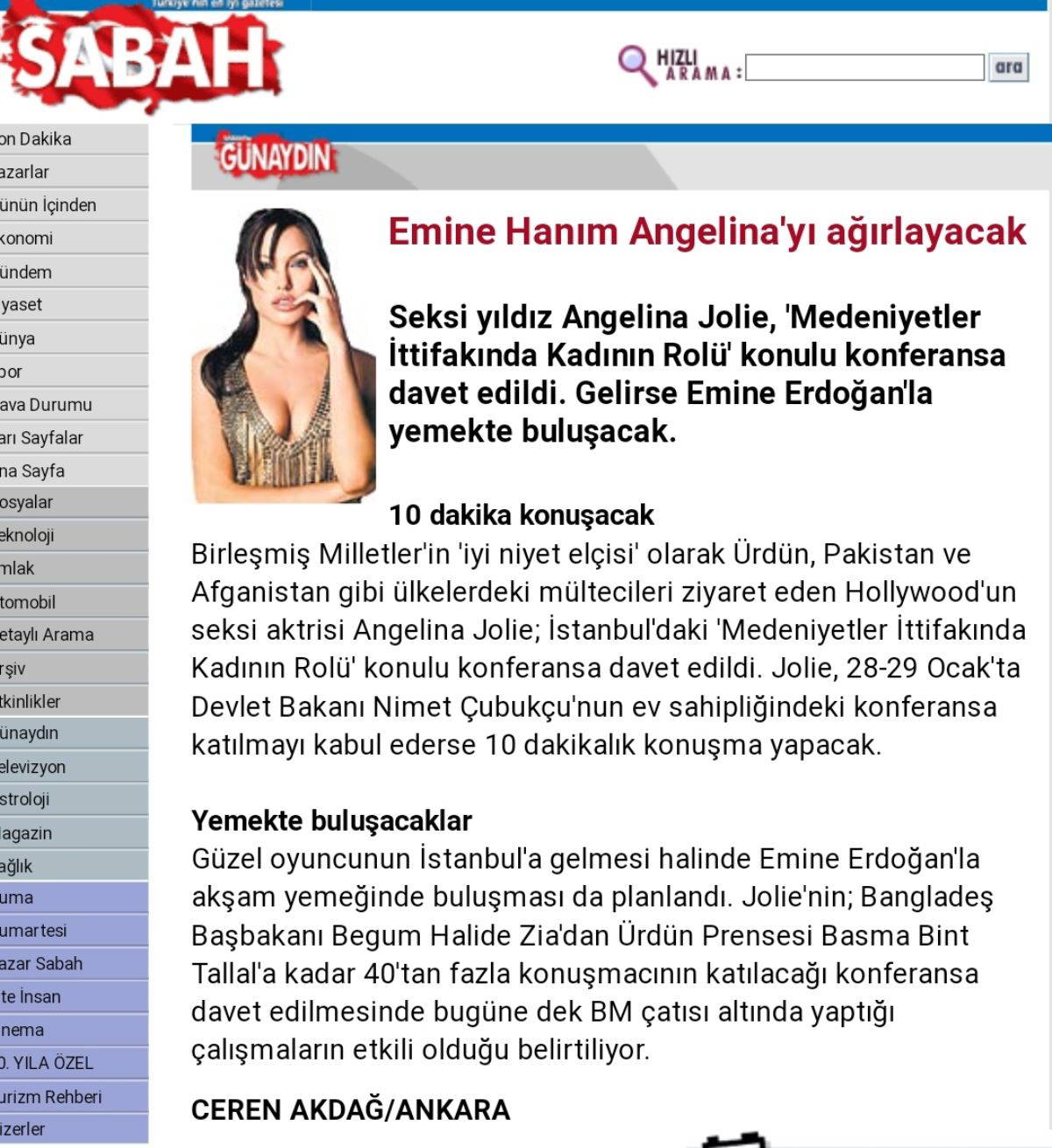 “Angelina Jolie, ‘Medeniyetler İttifakında Kadının Rolü’ konulu konferansa davet edildi. Gelirse Emine Erdoğan’la yemekte buluşacak.”