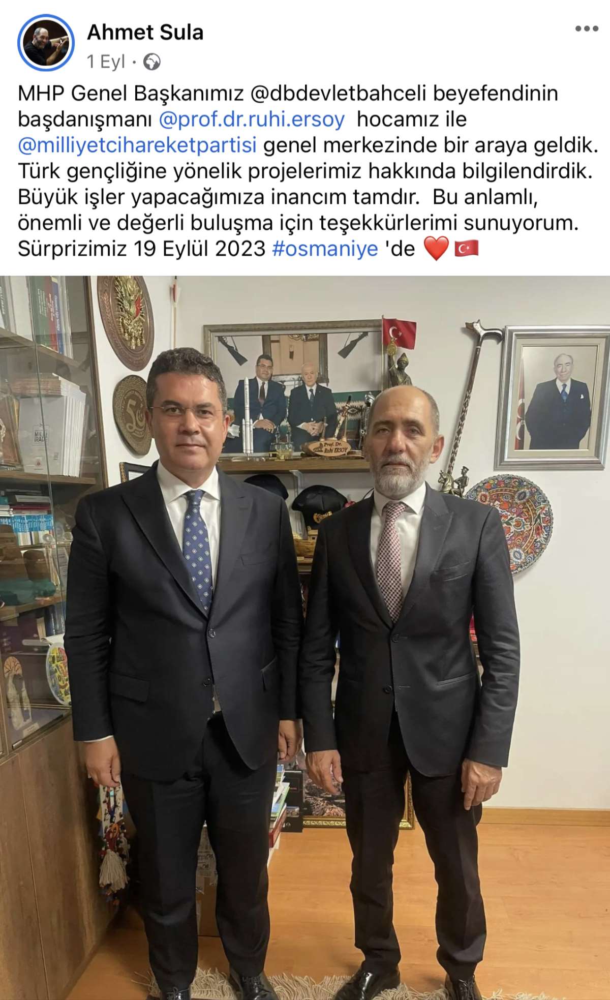 Haberlerle yetinmeyip Ahmet Sula’nın sosyal medya hesabını açtım. İlk değildi... Ahmet Sula, MHP Genel Merkezi’ni, emniyet müdürü sıfatıyla zaman zaman ziyaret ediyordu. Örneğin 19 Eylül’deki ziyaretin fotoğrafını şöyle paylaşmıştı: “MHP Genel Başkanımız Devlet Bahçeli Beyefendi’nin Başdanışmanı Prof. Dr. Ruhi Ersoy Hocamız ile MHP Genel Merkezi’nde bir araya geldik. Türk gençliğine yönelik projelerimiz hakkında bilgilendirdik. Büyük işler yapacağımıza inancım tamdır.”